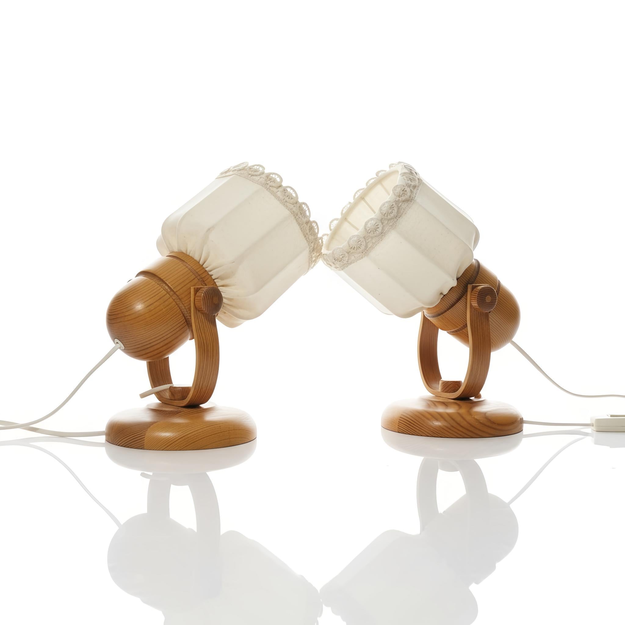 Beautifully whimsical and rich with Scandinavian charm, this pair of vintage Markslöjd pine wall lamps will add a soft, storybook feel to any space. With original lace-trimmed, cocoon-like fabric shades, these lampshades combine soft curves with warm materials for an inviting, nostalgic look.