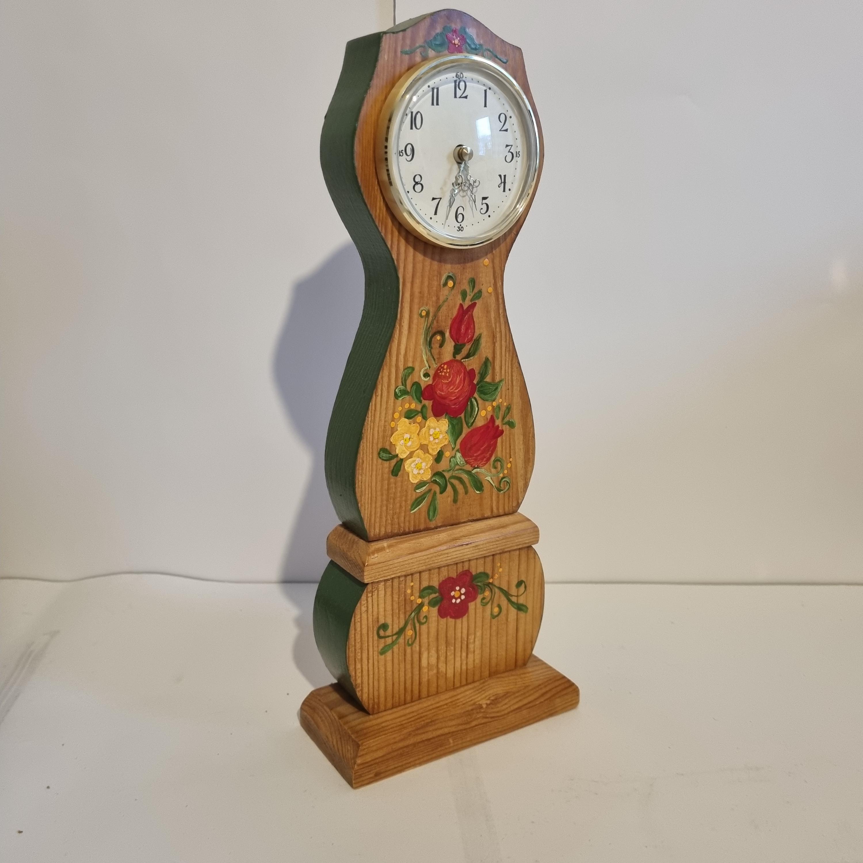 This beautiful Swedish Mora table clock is a true example of classic Scandinavian craftsmanship. Made of wood and delicately hand-painted with traditional Swedish floral motifs, it brings timeless charm and character to any interior.