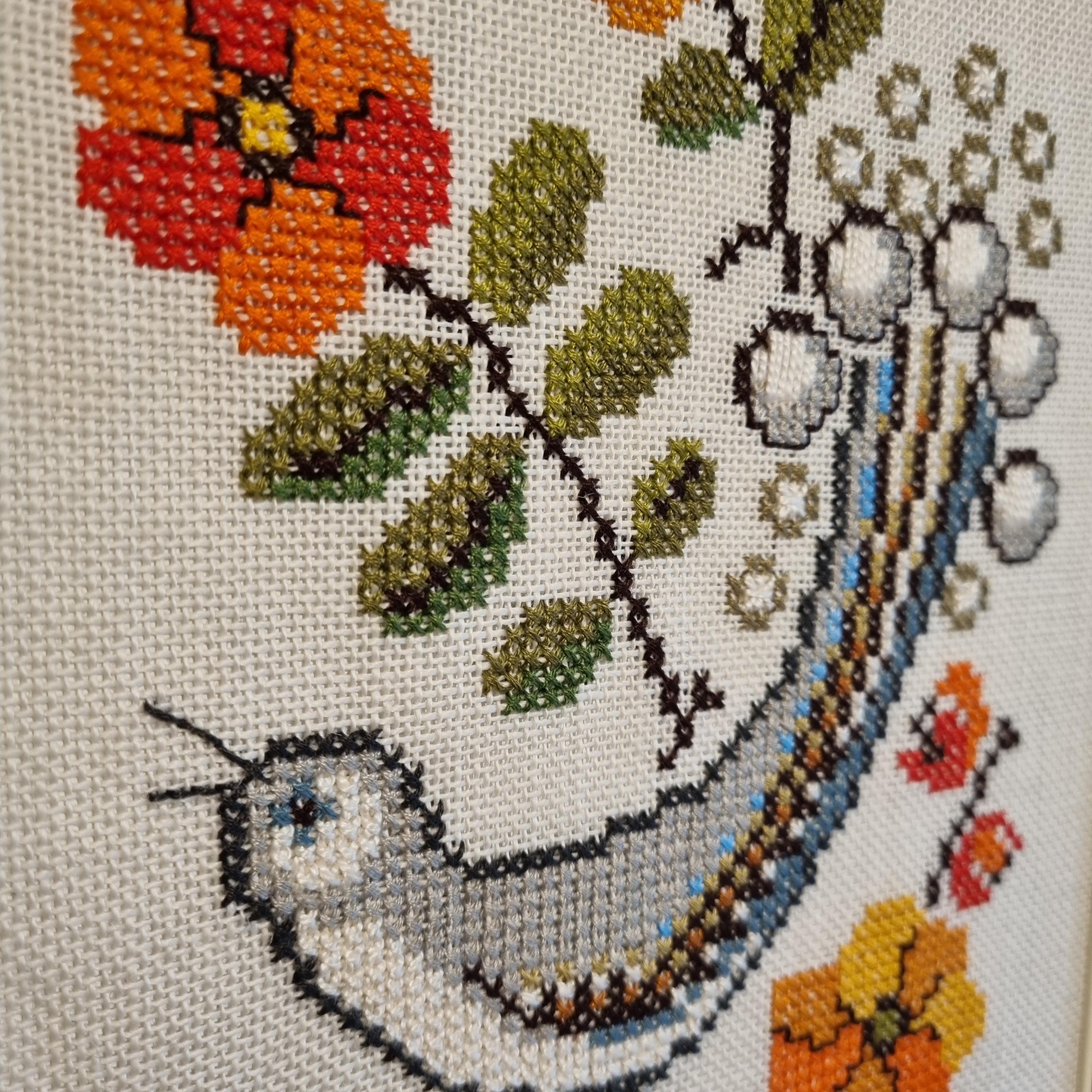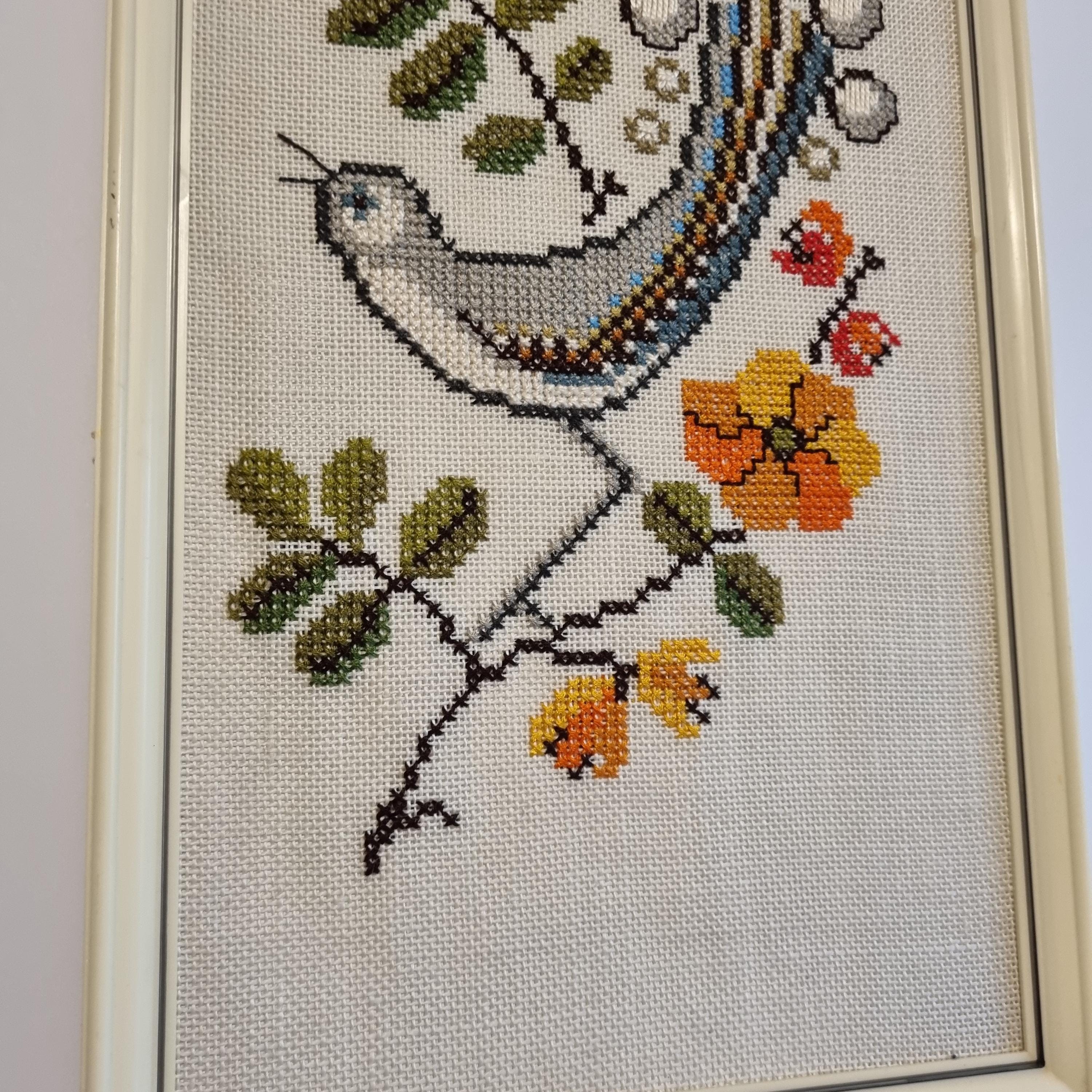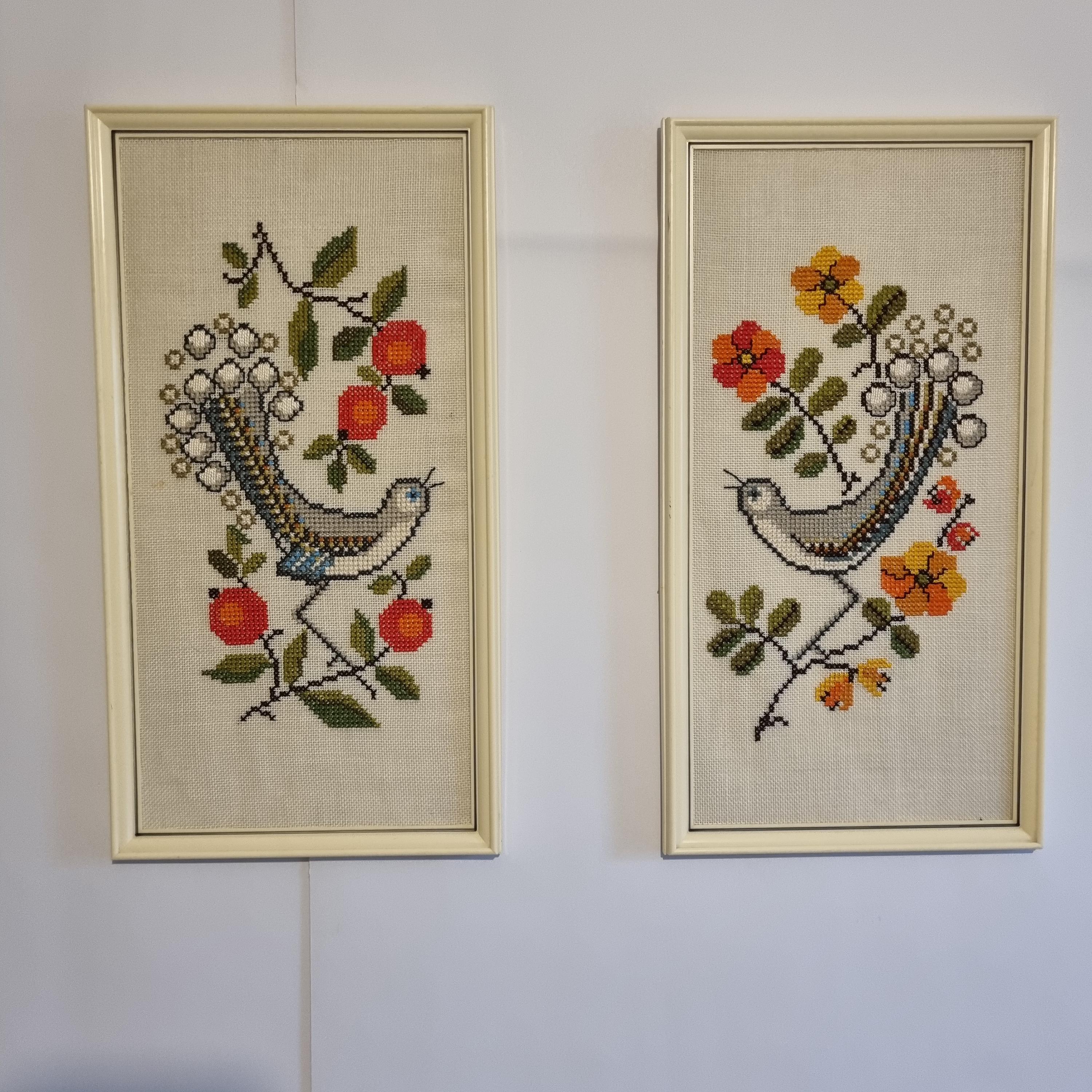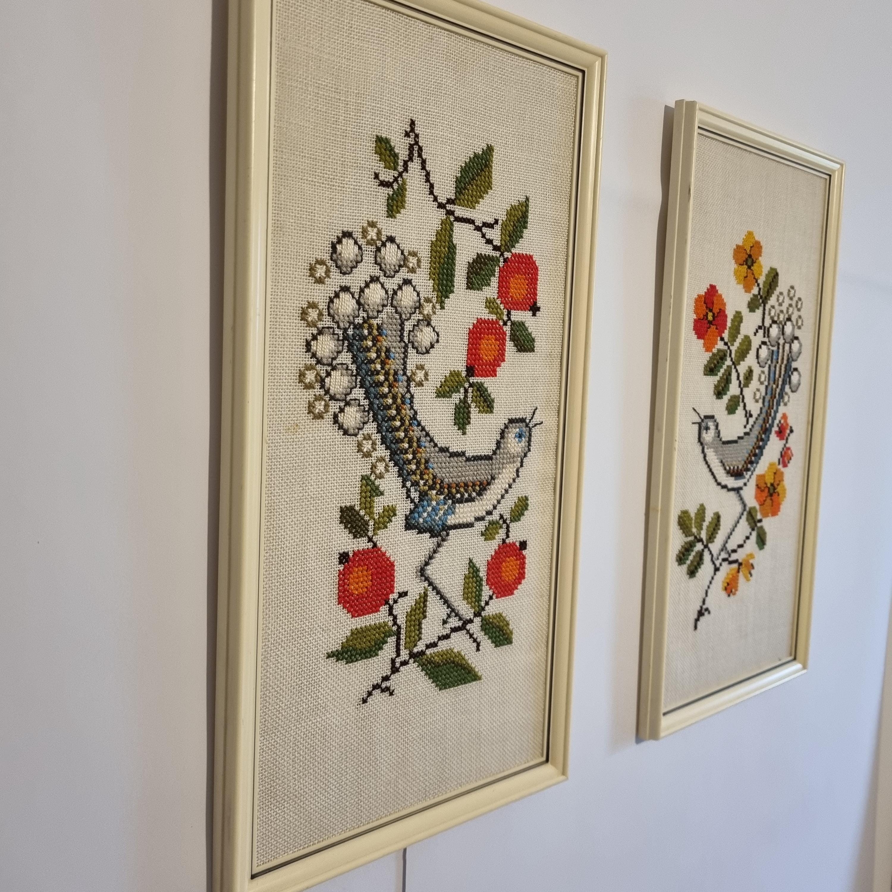 Each hand-stitched panel features a stylized bird perched among blooming florals, bursting with life and color. The cross stitch technique adds rich, tactile detail, while the vertical format and light frame give the pair an airy, elegant presence.