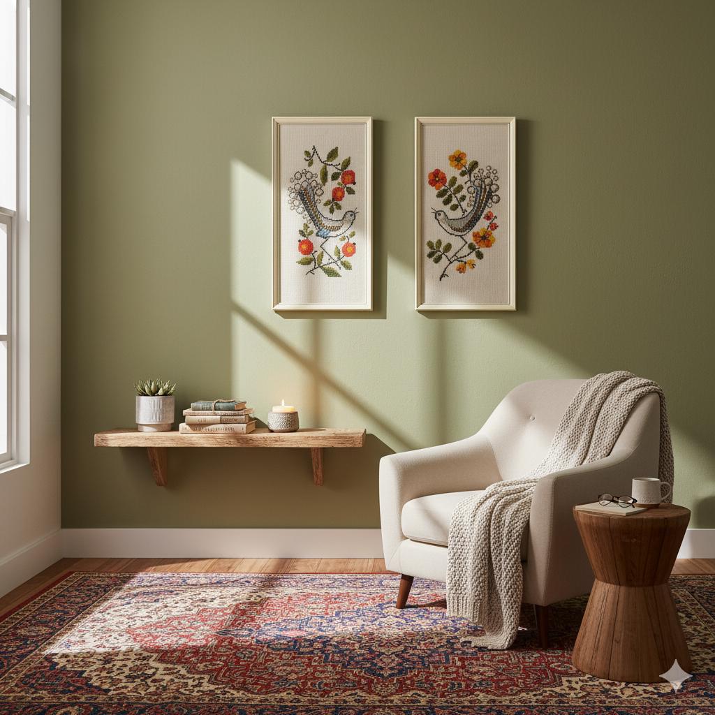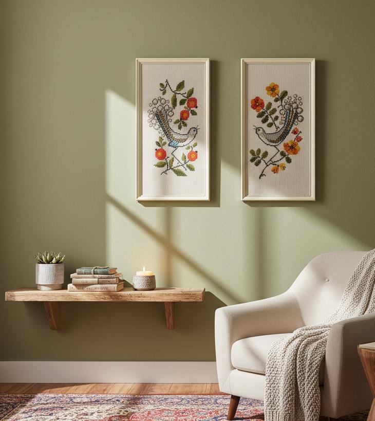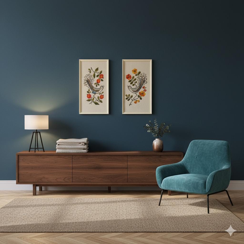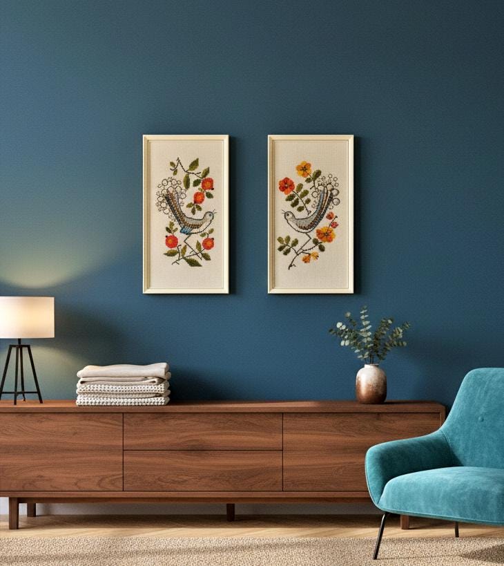 This vibrant pair of vintage embroidered bird artworks adapts effortlessly to any interior — from minimalist neutrals to bold statement walls. Whether your home leans Scandi, boho, mid-century or cottagecore, these framed folk pieces bring warmth, charm and soul to any space.