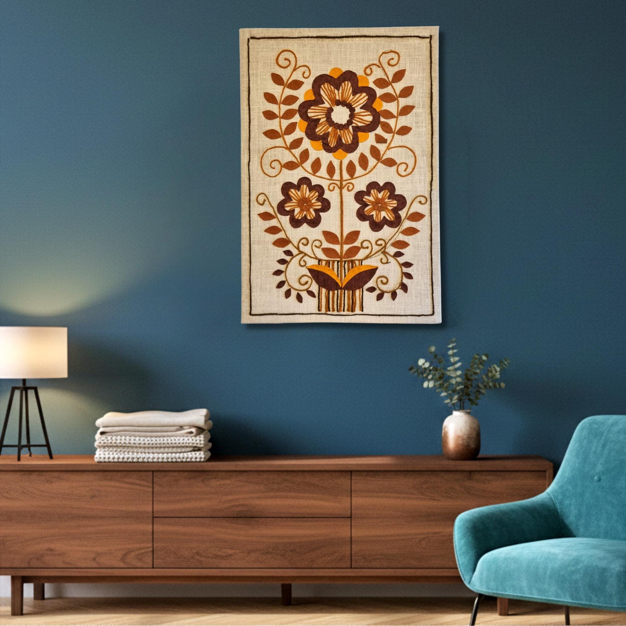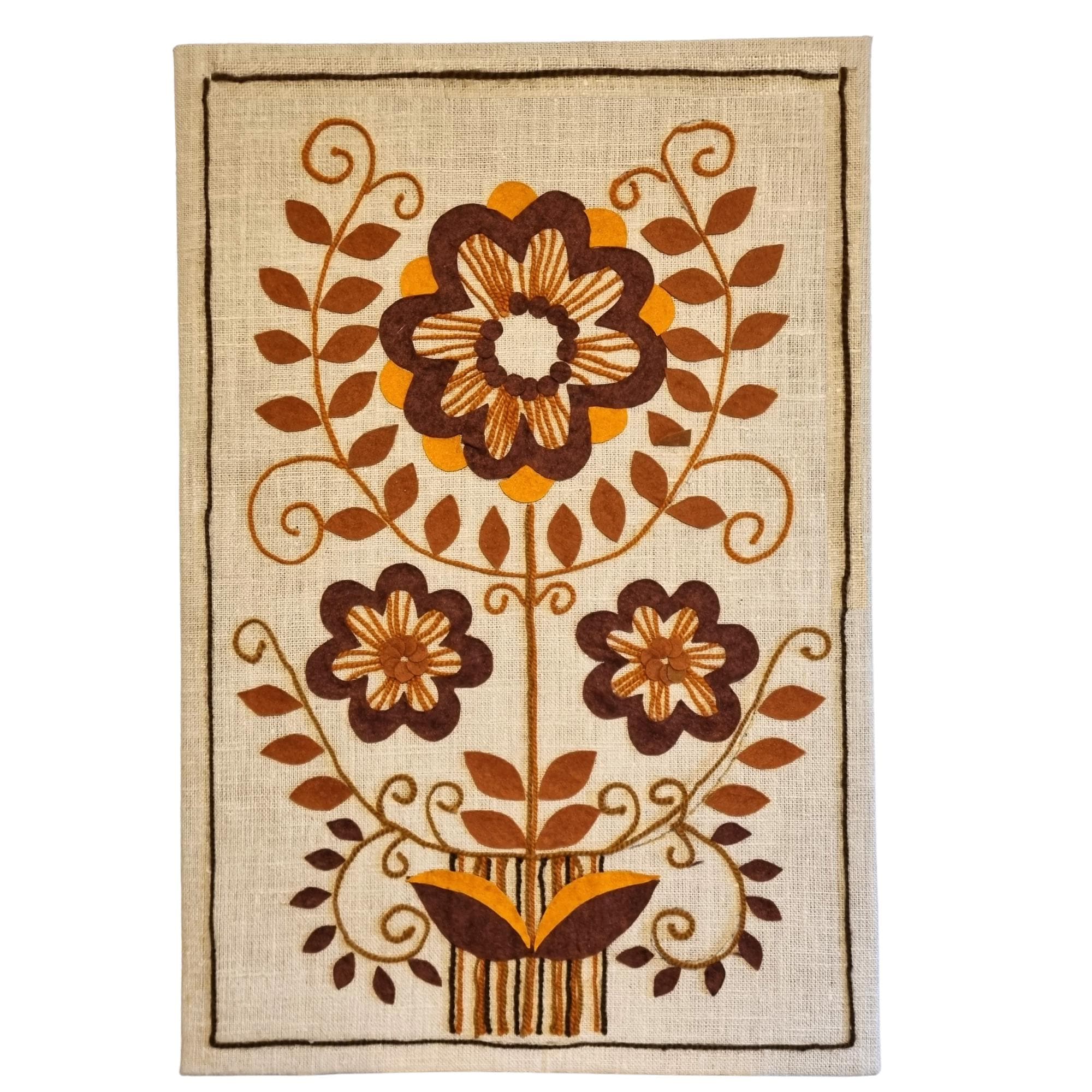 This striking vintage textile wall hanging from the 1970s is a bold expression of Scandinavian folk-inspired design — rendered in rich earth tones, intricate appliqué work, and a generous 70 × 48 cm (27.6″ × 18.9″) size that makes it a true statement piece.