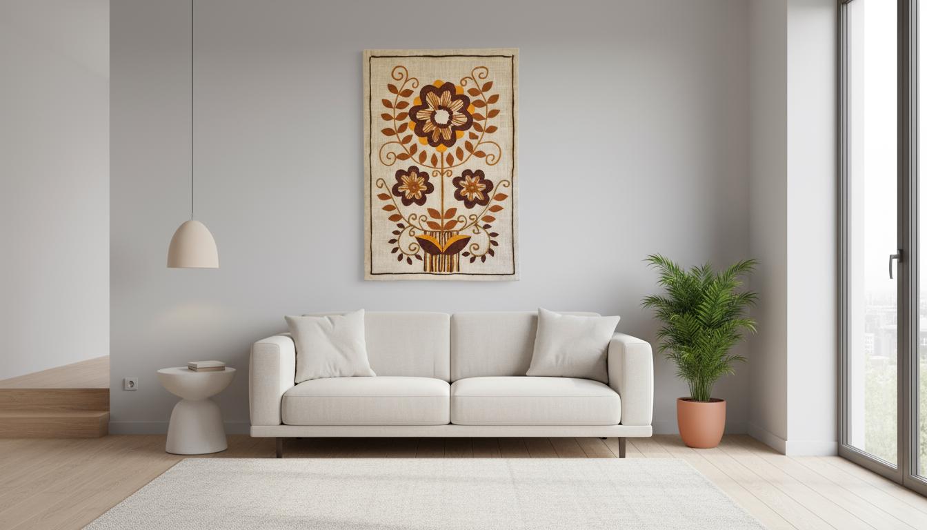 The symmetrical floral composition evokes natural harmony and geometric rhythm, creating a centerpiece that feels both grounded and uplifting. Deep ochres, warm rust, chocolate brown and soft beige tones bring depth and visual warmth to any wall — from minimalist interiors to eclectic boho spaces.