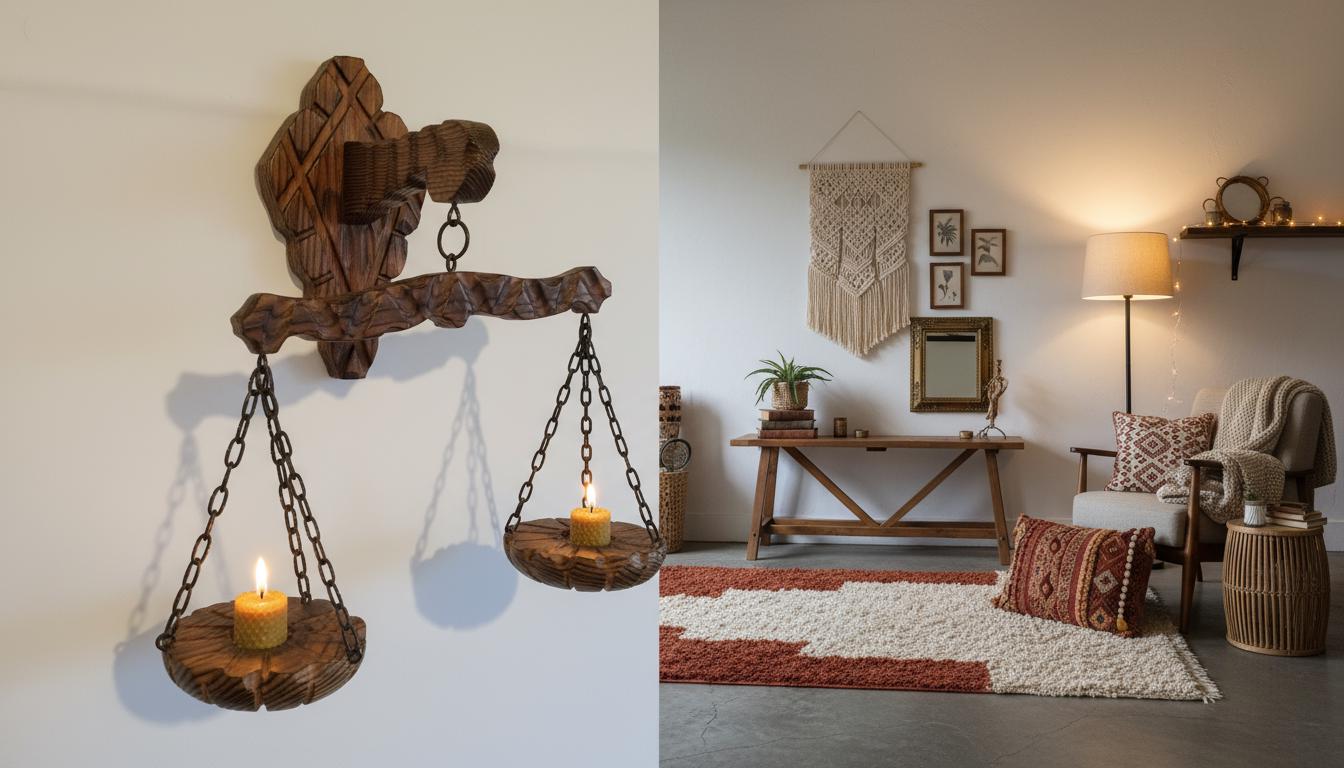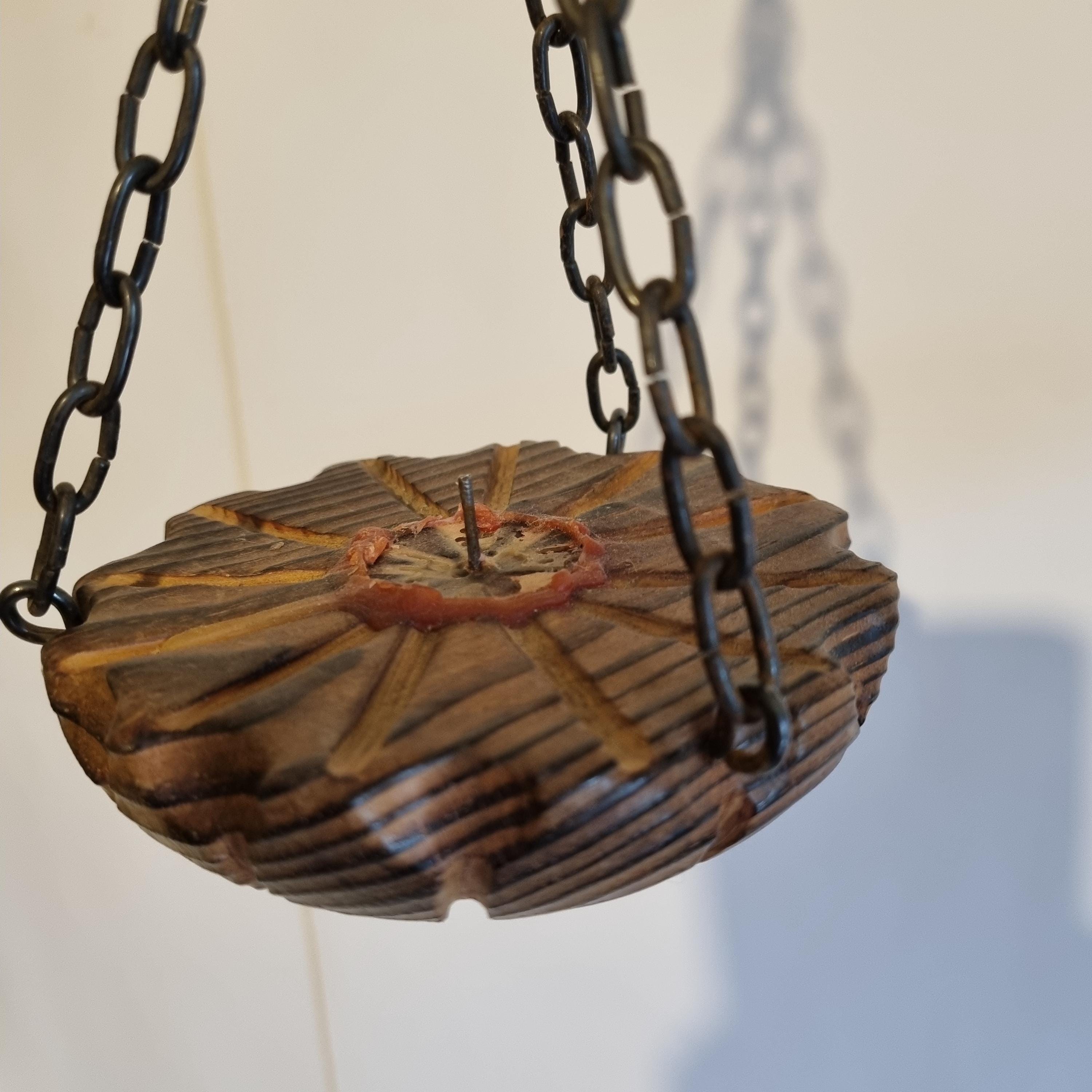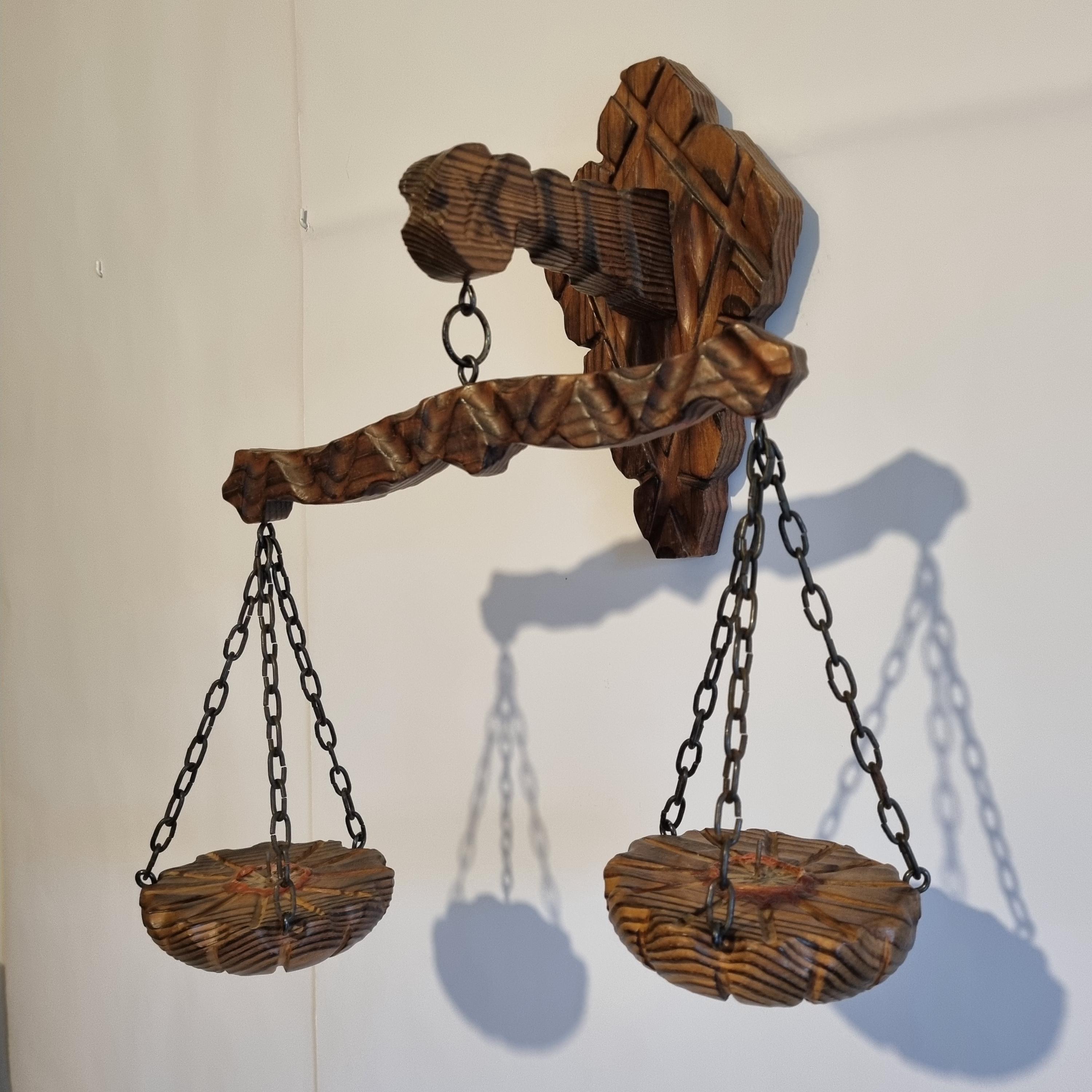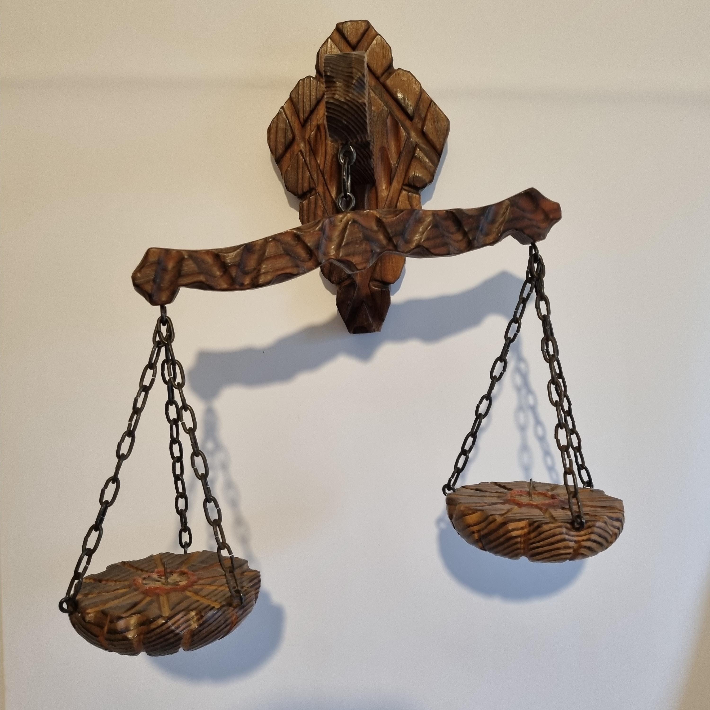 Rustic wooden wall scale candle holder with trays on chains