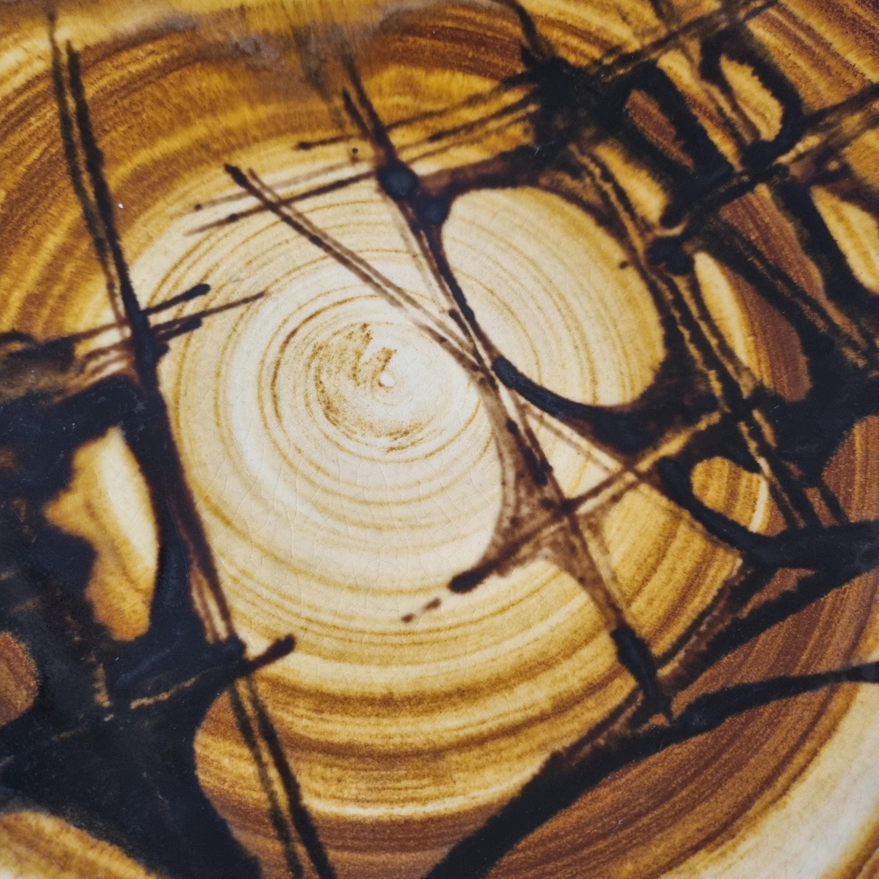 A powerful mix of Scandinavian modernism and bohemian flair, this bowl features earthy tones and dynamic abstract decoration, making it a perfect centrepiece for a retro, boho, or modernist interior. It can be used as a statement fruit bowl, a decorative wall piece, or a collector's display item.