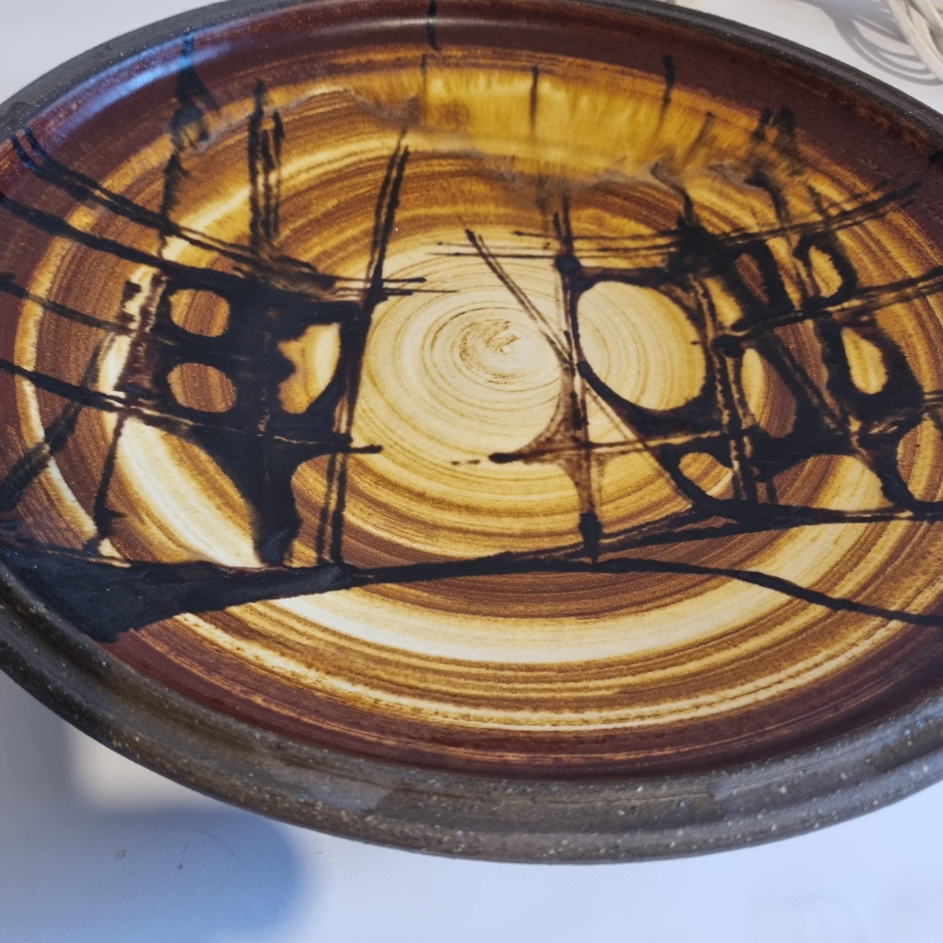 This striking studio pottery bowl by renowned Danish ceramicist Inge Lise Eder is a standout piece of mid-century Scandinavian design. Hand-thrown and signed on the base, it showcases the expressive and organic aesthetic typical of 1960s Danish studio ceramics.
