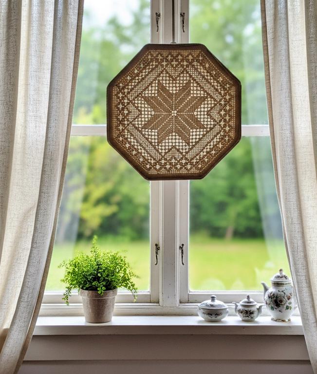 A rare and beautifully preserved Scandinavian pendant light crafted in Sweden during the 1940s, this unique lighting piece features a finely embroidered beige textile shade with an octagonal shape and intricate symmetrical pattern. A true testament to mid-century Swedish craftsmanship and textile artistry.