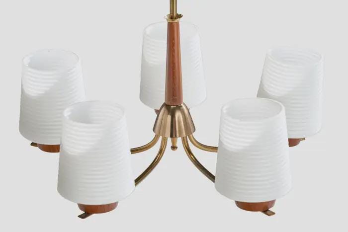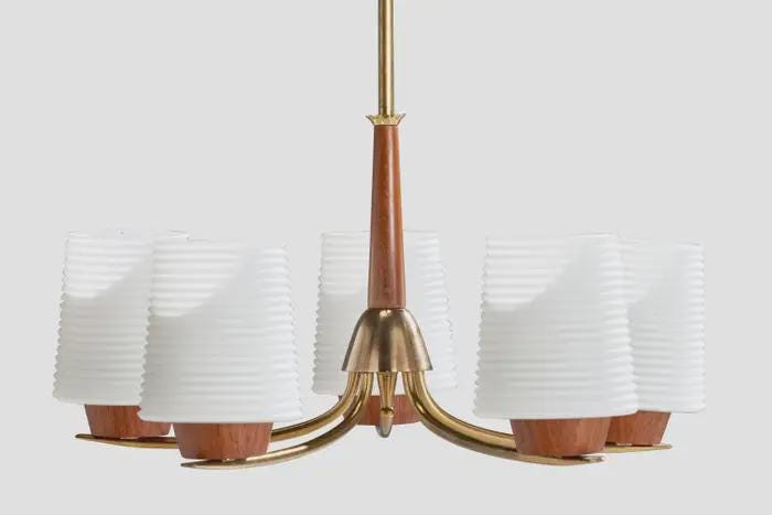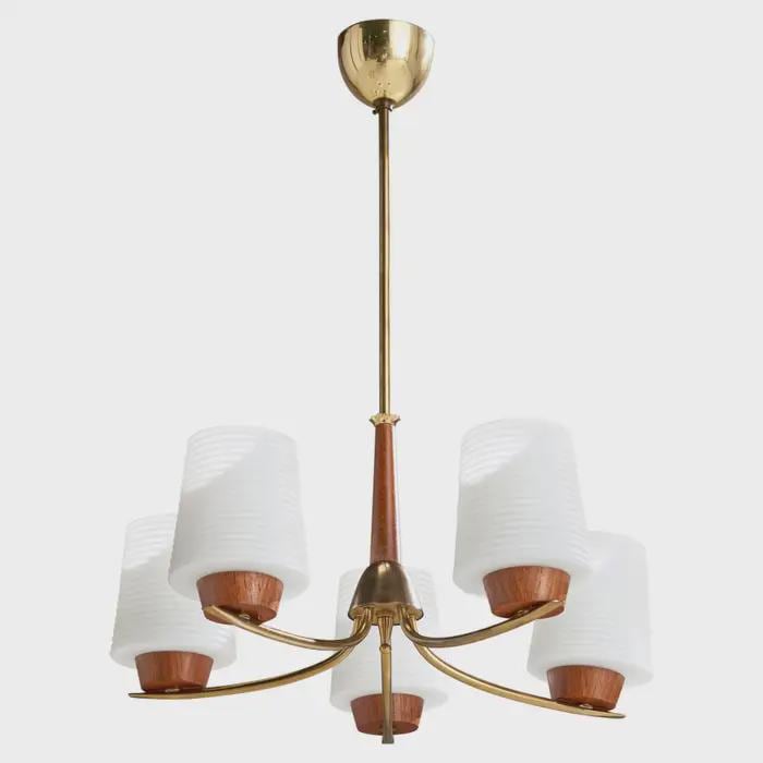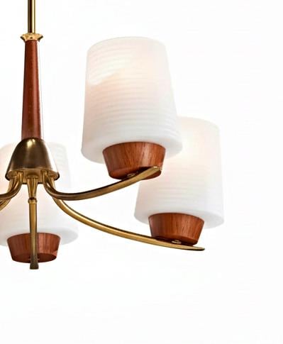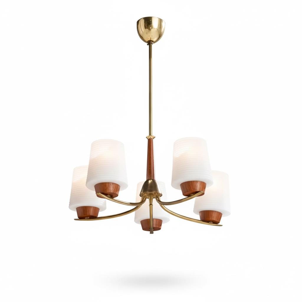 Swedish Mid-Century Chandelier in Brass, Teak & Opaline Glass — c. 1950s