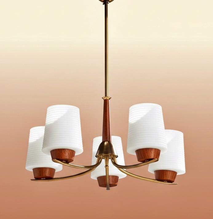 This rare five-arm ceiling light reflects the restrained elegance of Scandinavian modernism — warm materials, organic lines, and an architectural presence.