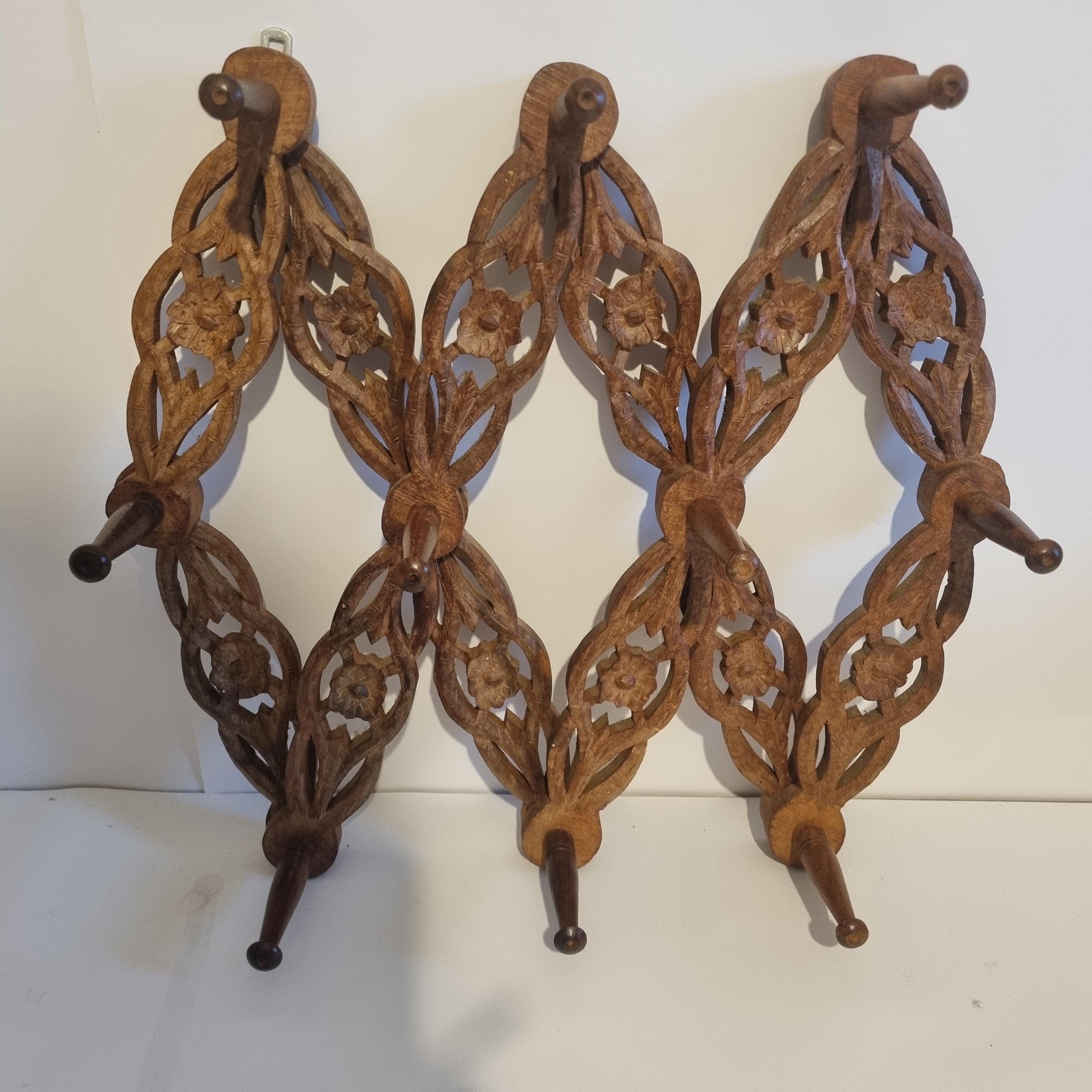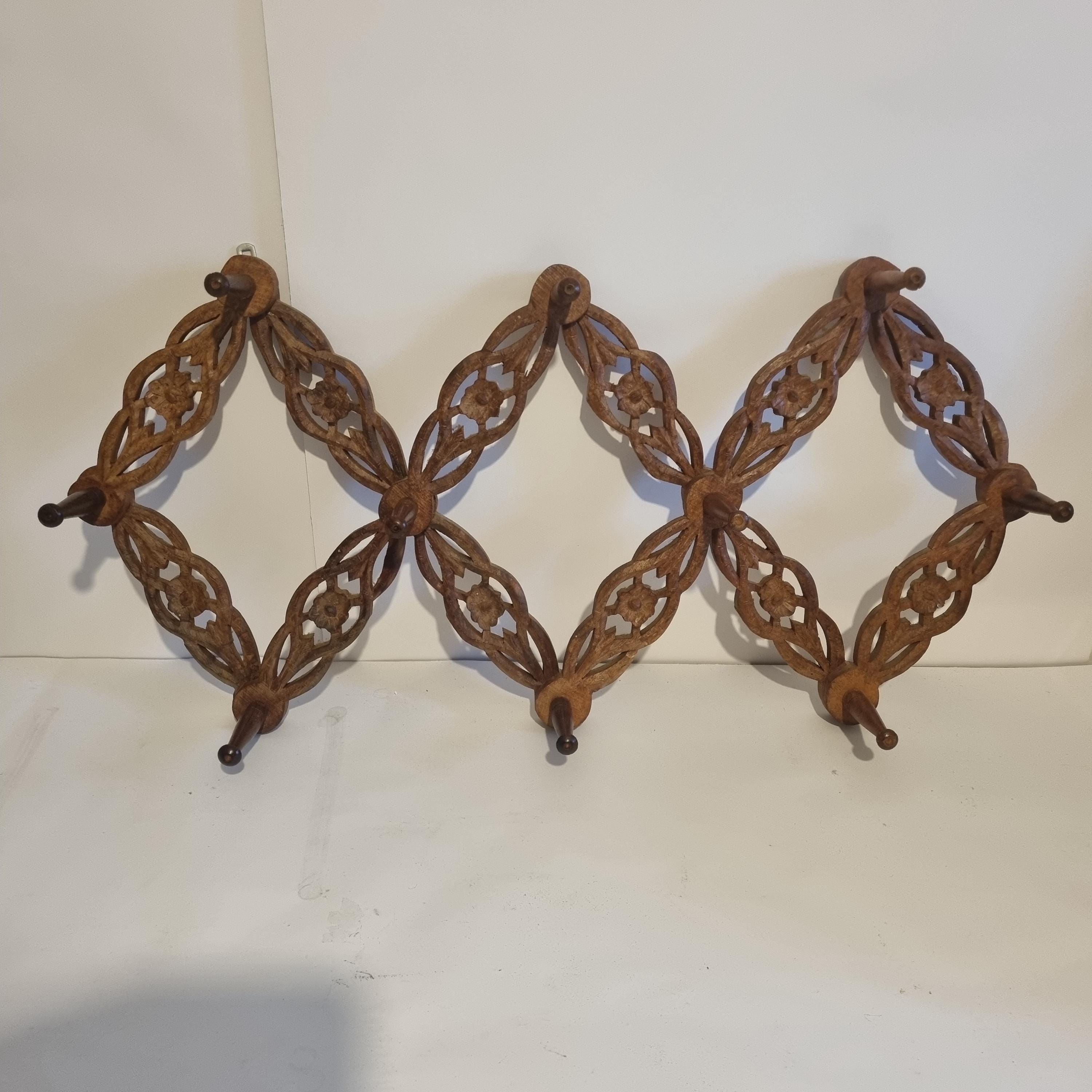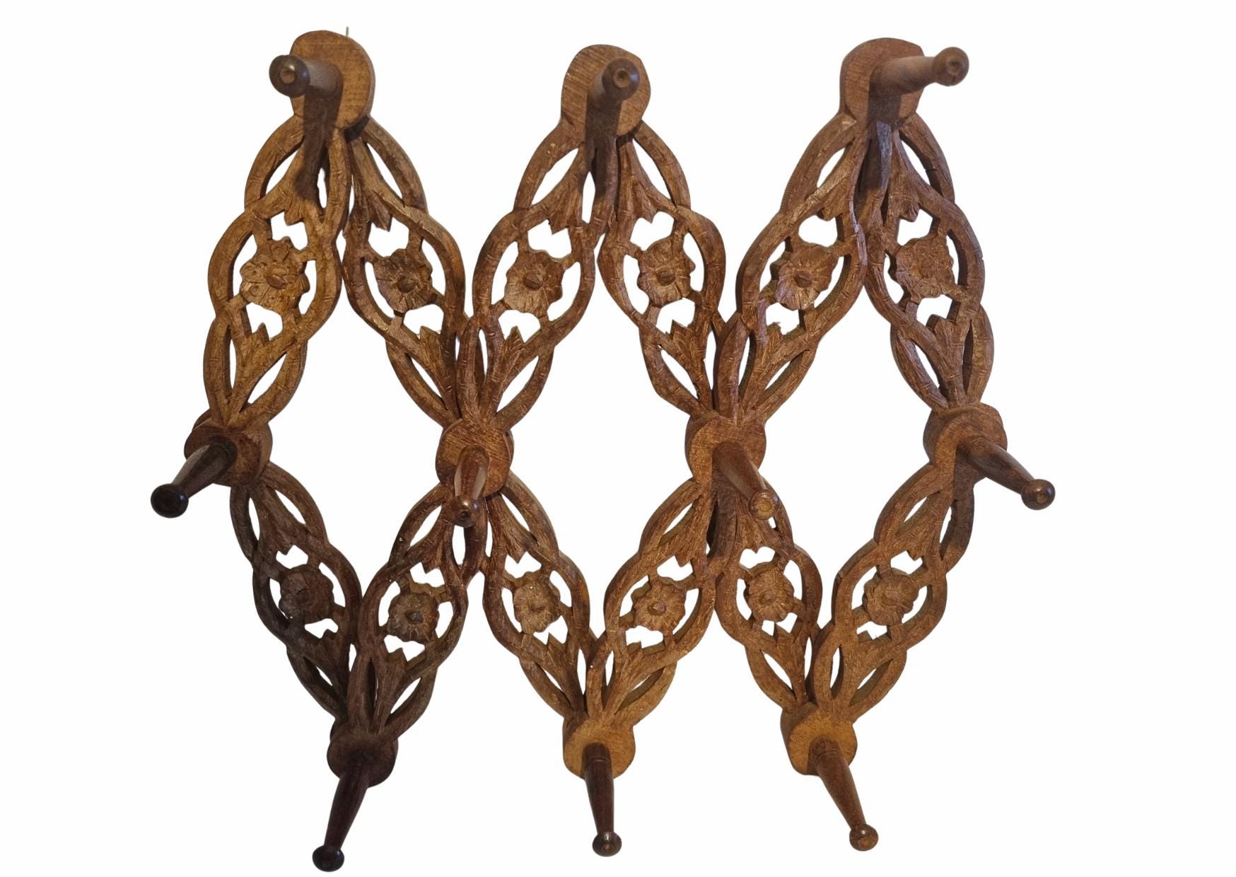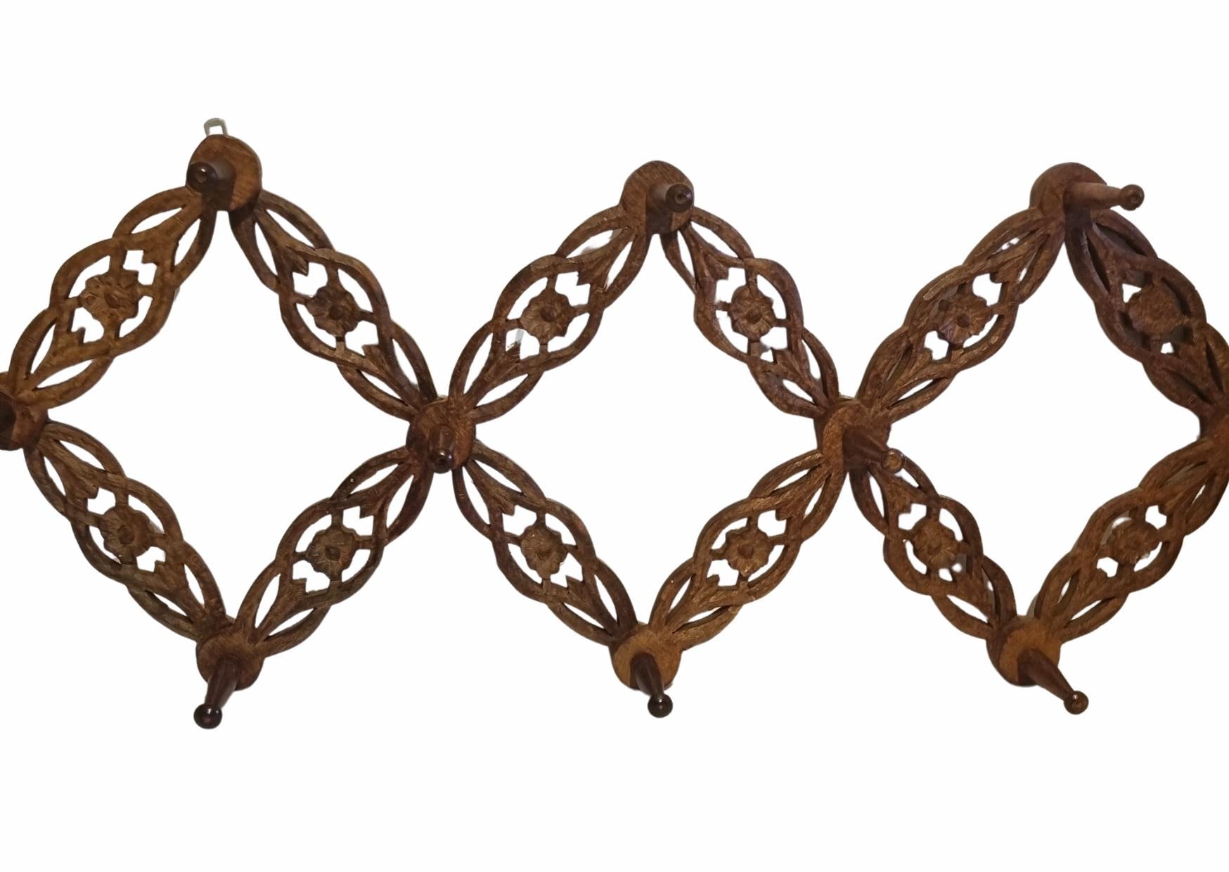 This beautifully hand-carved vintage coat rack is more than just a functional piece – it’s a decorative element for any interior. With its intricate openwork floral patterns and warm, natural wood finish, it perfectly combines rustic charm with classic elegance.