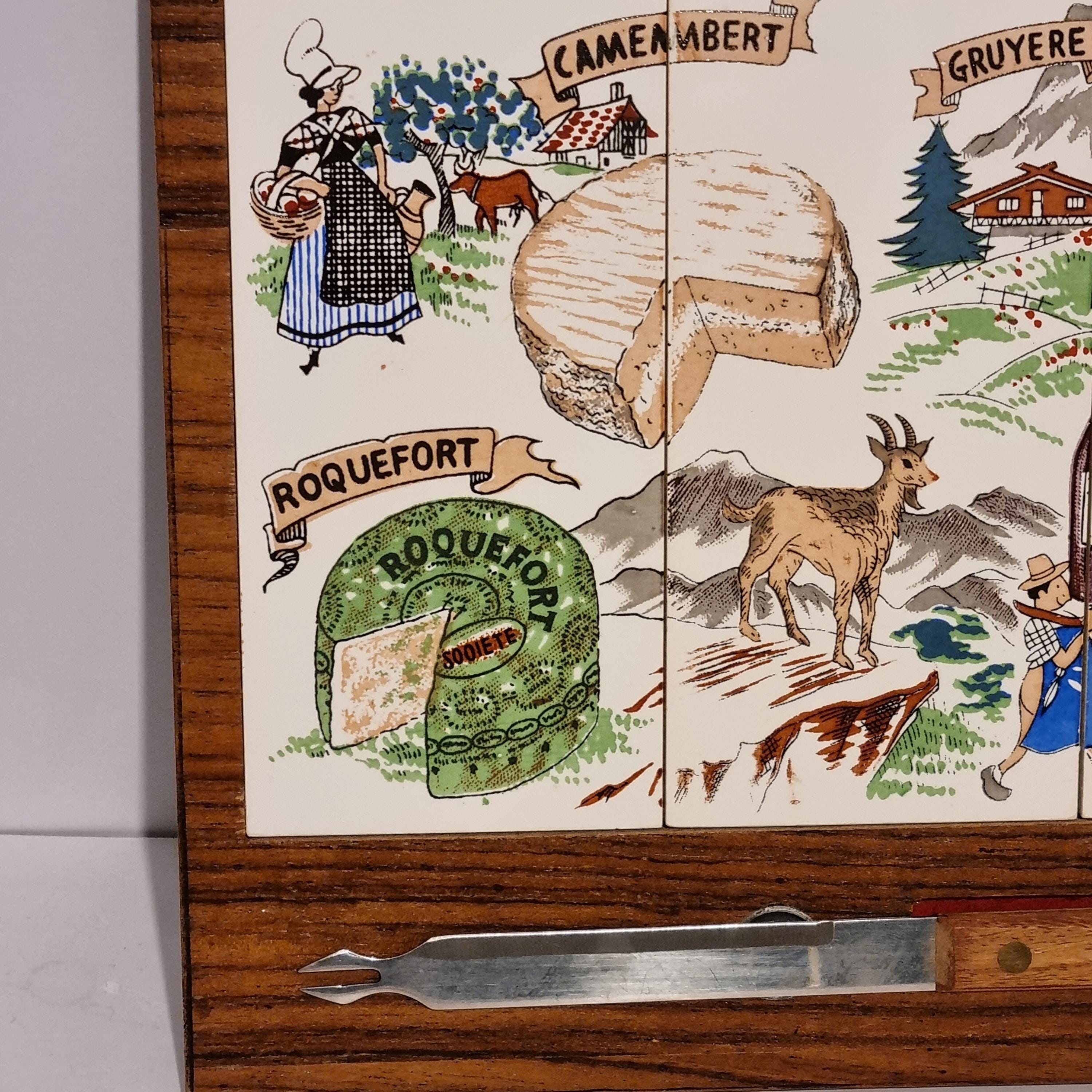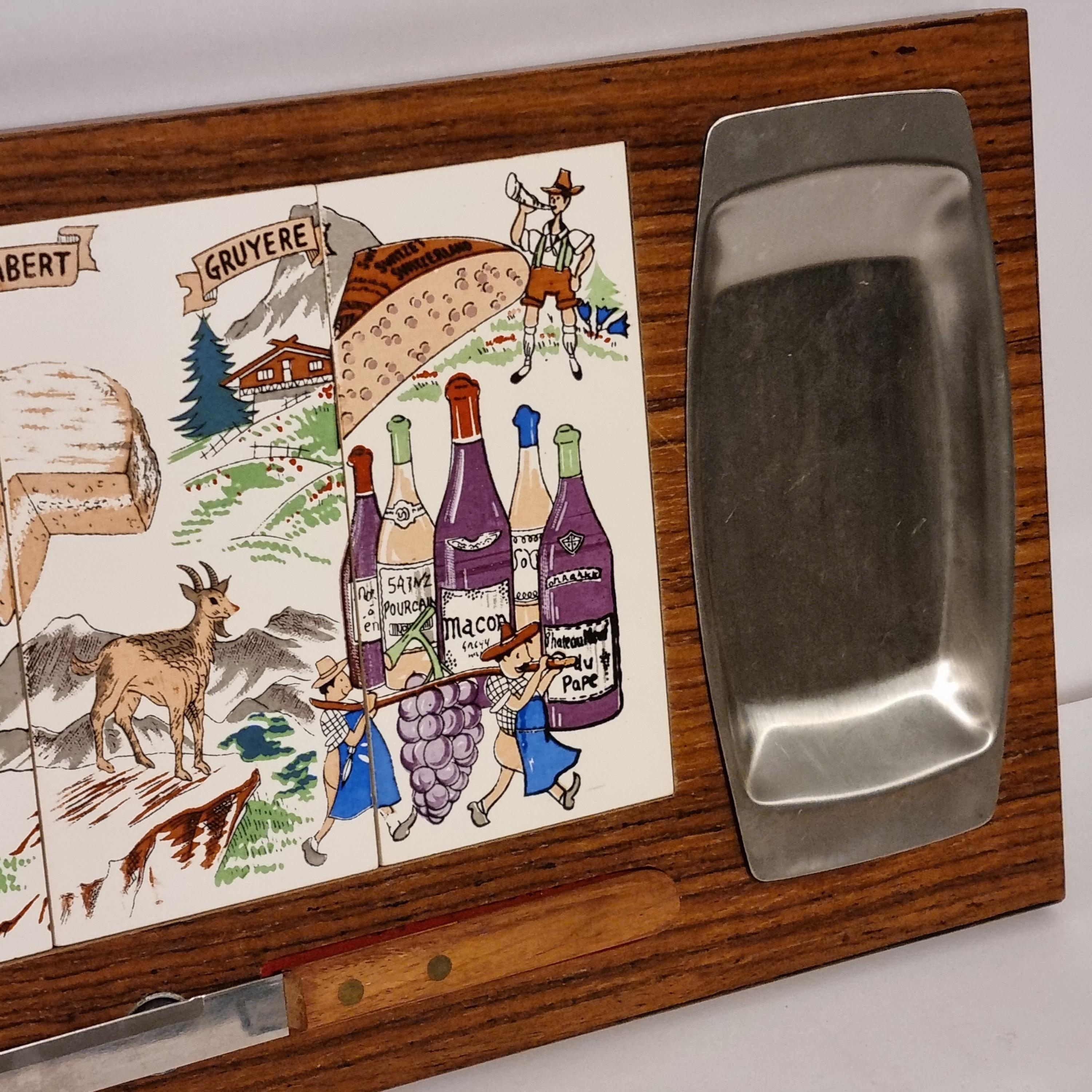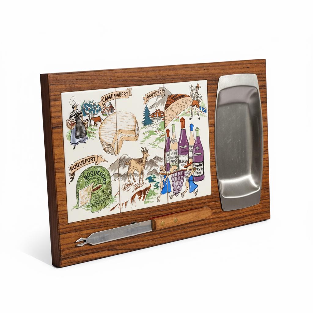 Serve in style with this charming mid-century cheese board set. Featuring a rich wooden base, colorful ceramic tile with retro illustrations, and built-in metal dish and serving knife, it's a functional and decorative piece perfect for charcuterie, wine nights, or vintage kitchen décor. A great addition to any Nordic-inspired or MCM home.