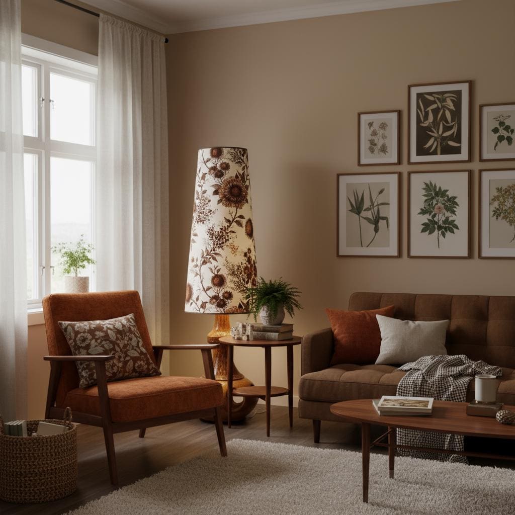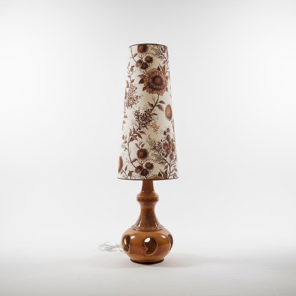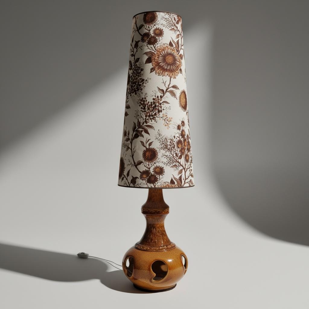 The hand-crafted ceramic base features a rich, glossy brown glaze that beautifully reflects the light, while the original fabric lampshade—with its warm floral motif—adds a soft, nostalgic touch. Its silhouette and material palette perfectly embody the mid-century modern aesthetic, merging effortlessly with boho and retro-inspired interiors.
