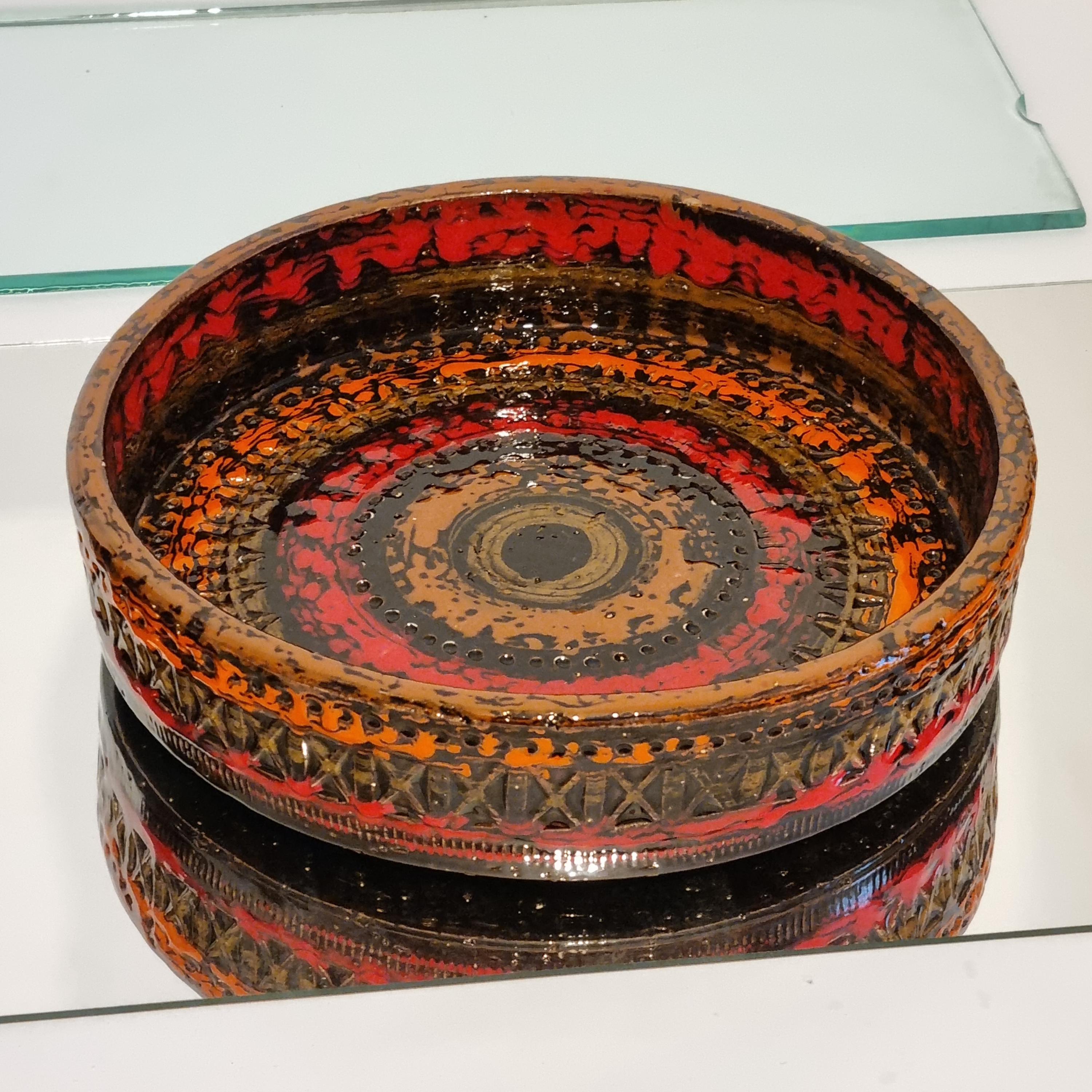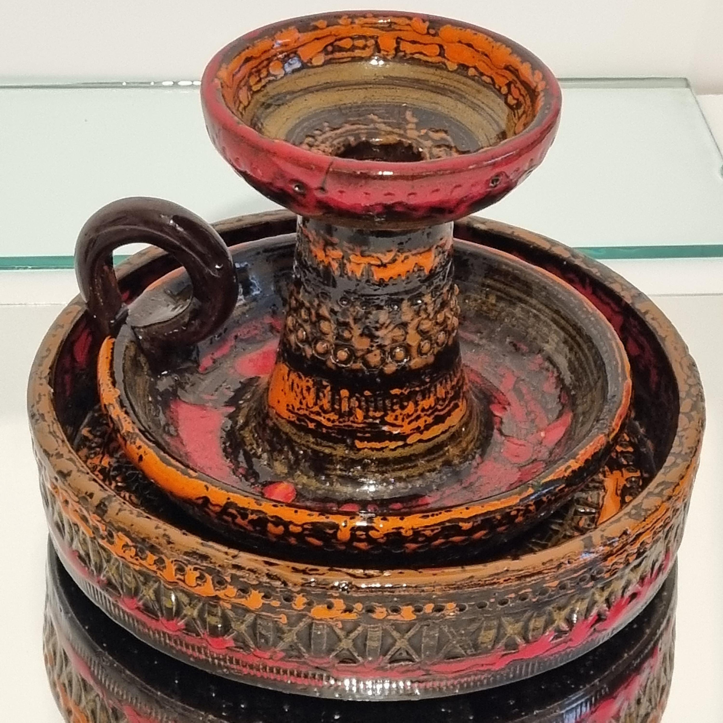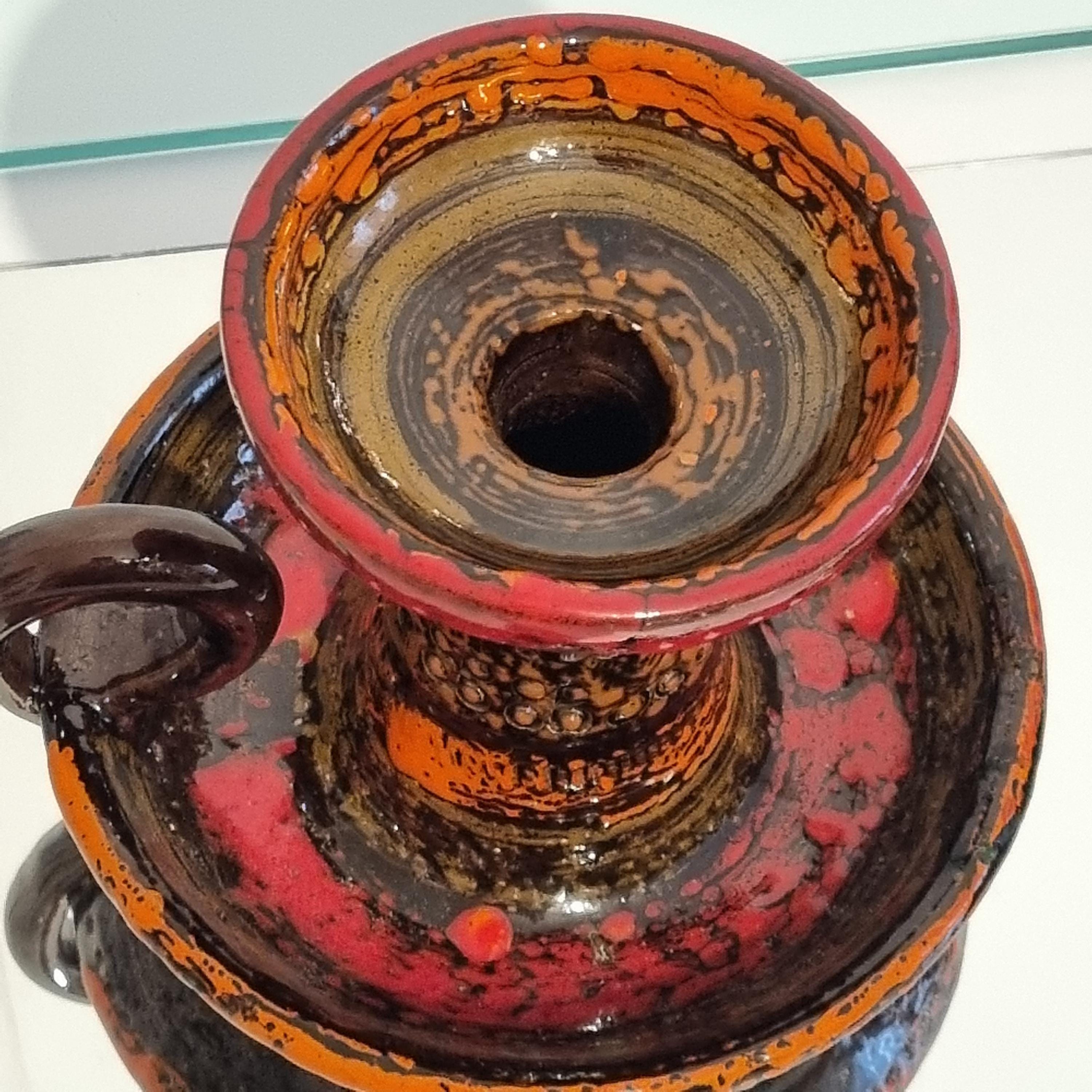Striking pair of mid-century West German ceramics featuring vivid orange, red, and brown “fat lava” glazes. The set includes a sculptural handled candlestick and a low decorative bowl, both showcasing the textured volcanic glaze typical of 1960s German art pottery. A bold statement of mid-century modern design.