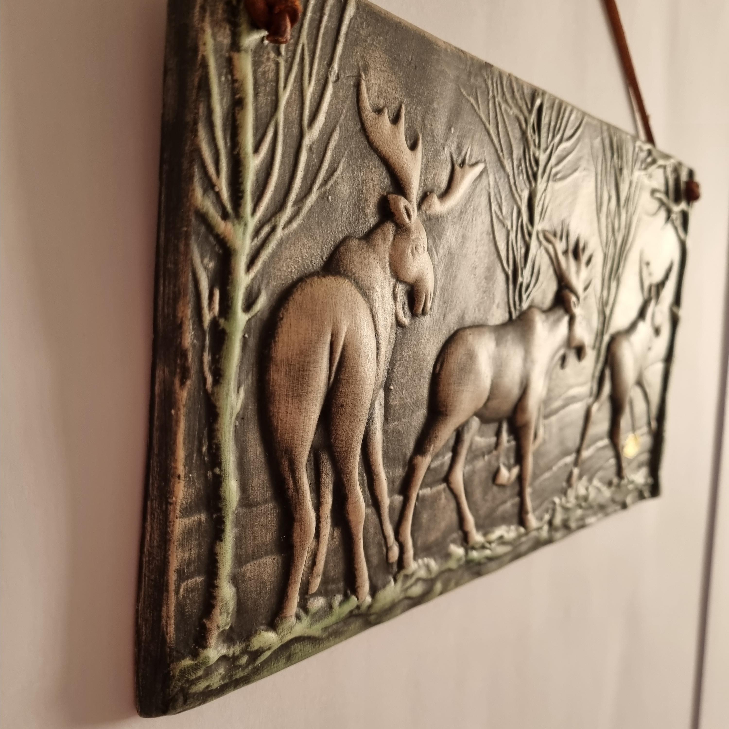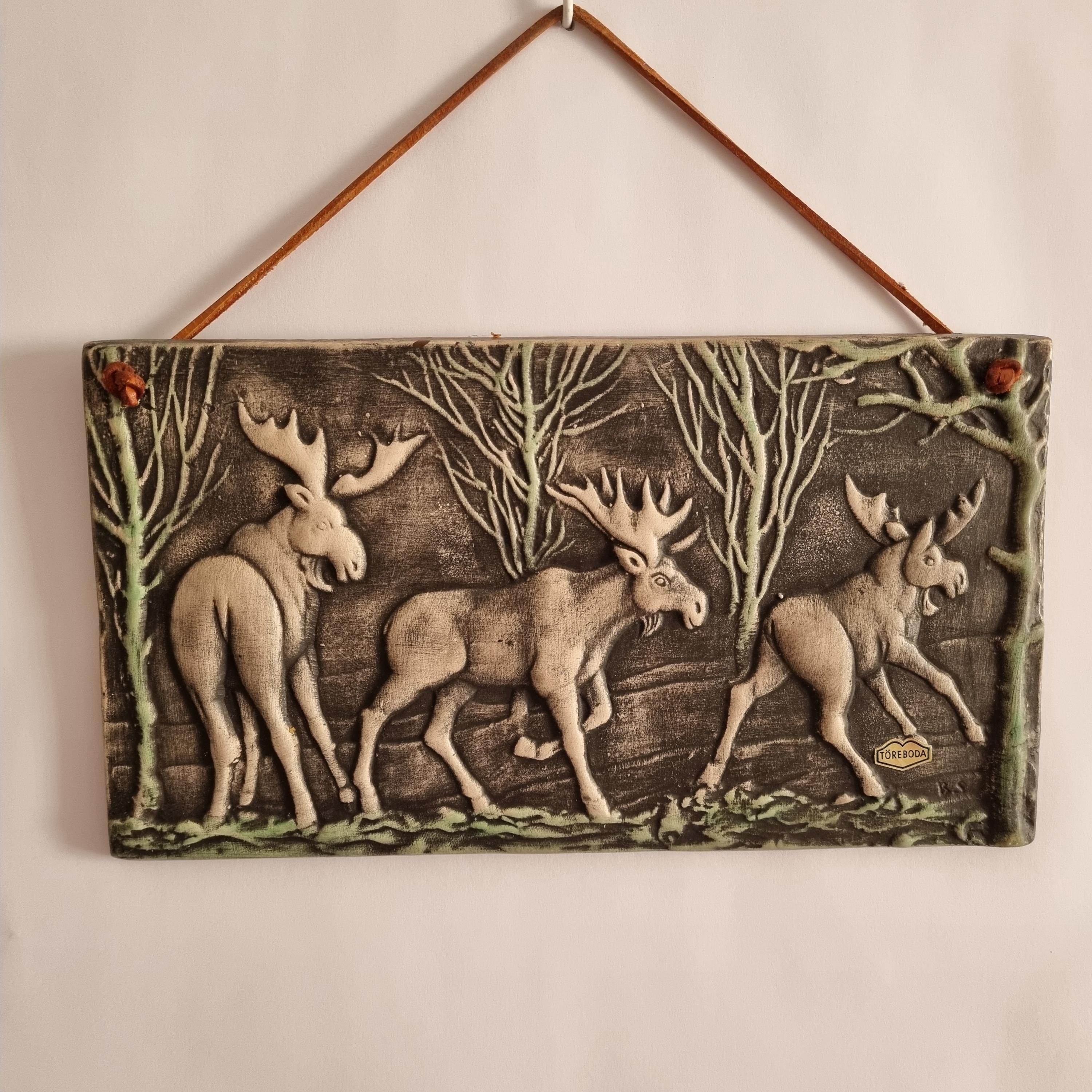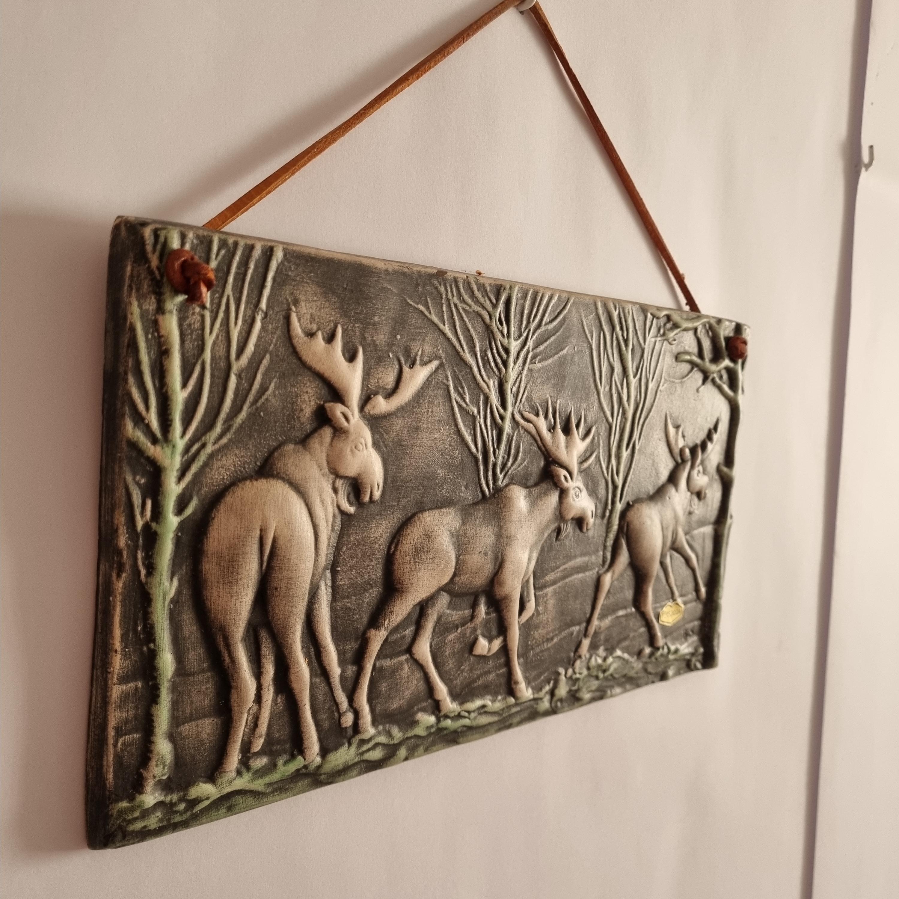 This vintage Swedish Toreboda ceramic wall plaque beautifully captures the essence of Nordic wildlife. The hand-molded relief depicts three majestic moose walking through a stylized forest, rendered in earthy tones of gray, cream, and soft green.