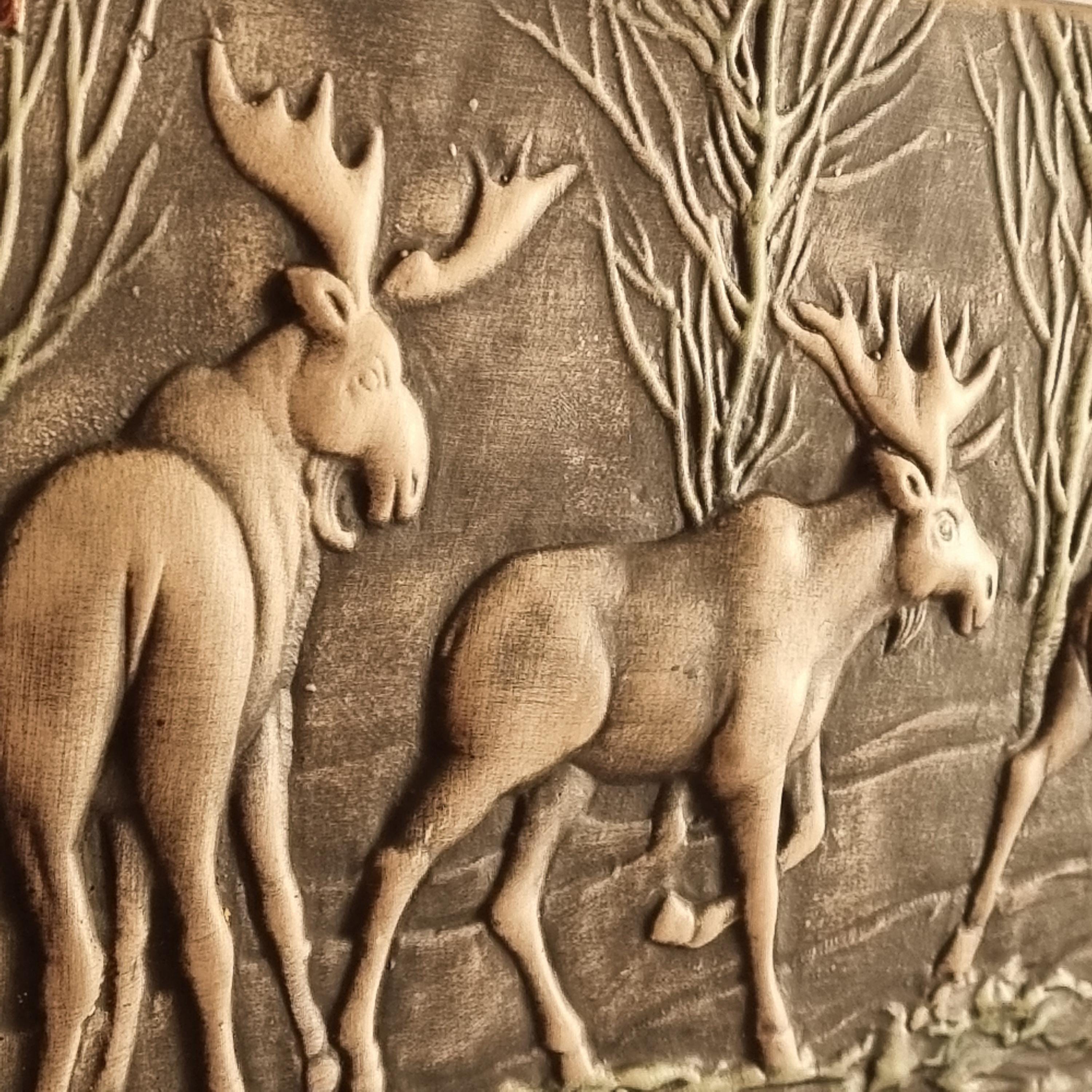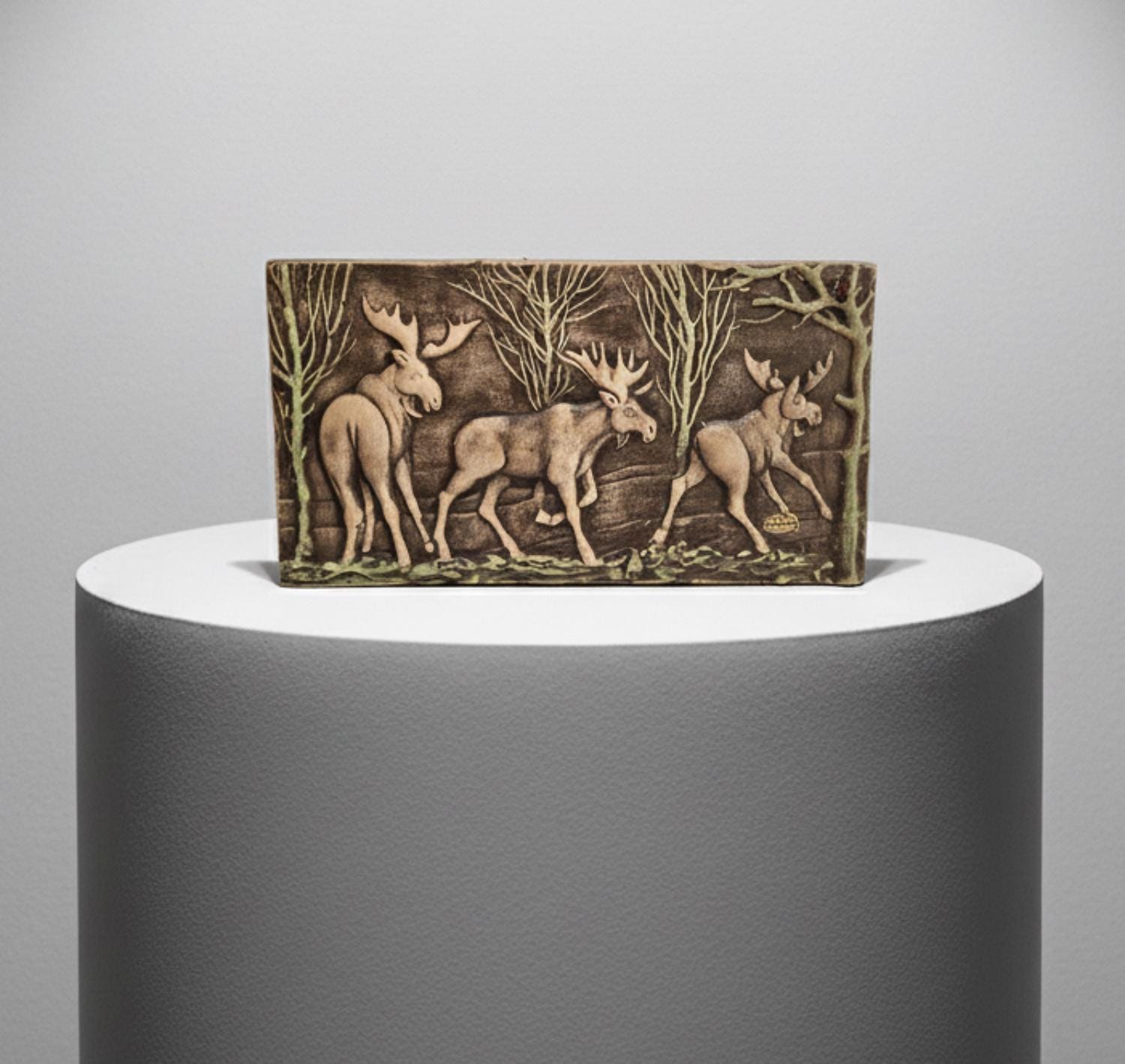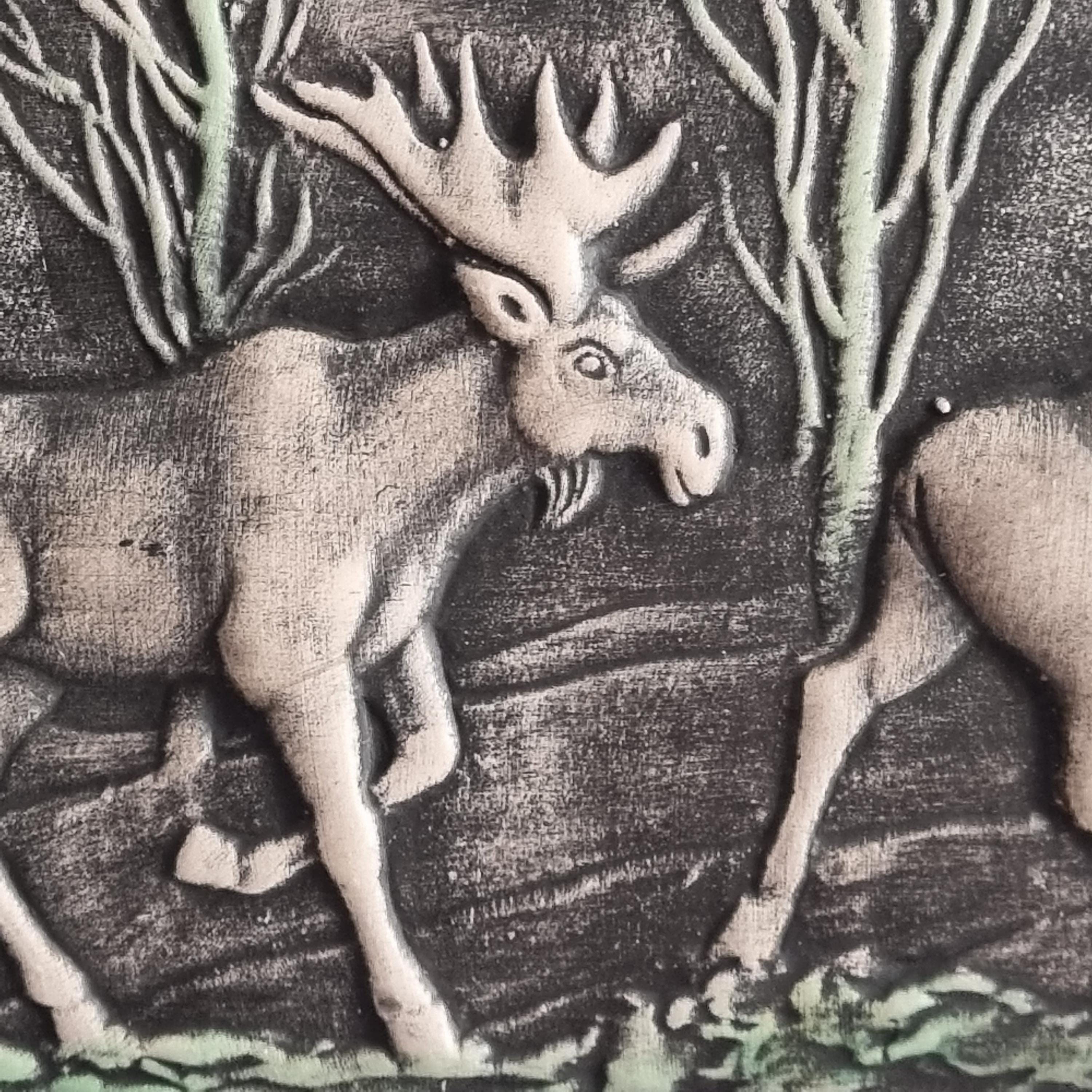 This vintage Swedish Toreboda ceramic wall plaque beautifully captures the essence of Nordic wildlife. The hand-molded relief depicts three majestic moose walking through a stylized forest, rendered in earthy tones of gray, cream, and soft green.