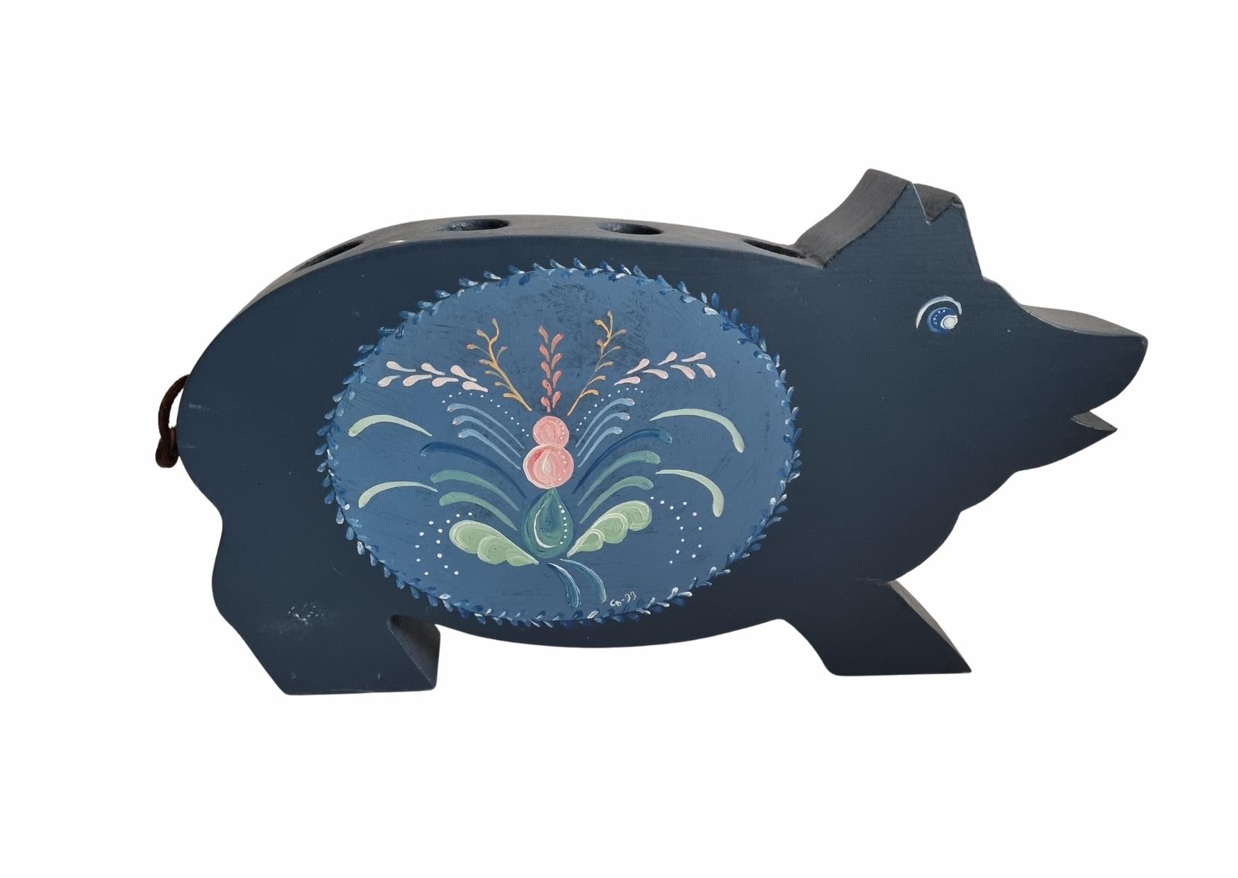 Each side of the pig is painted with traditional Swedish folk art motifs in soft blue, green, and coral tones. The candle holes are evenly spaced across the top, and the tail is finished with a charming leather loop. It's a piece that tells a story — cheerful, timeless, and entirely unique.