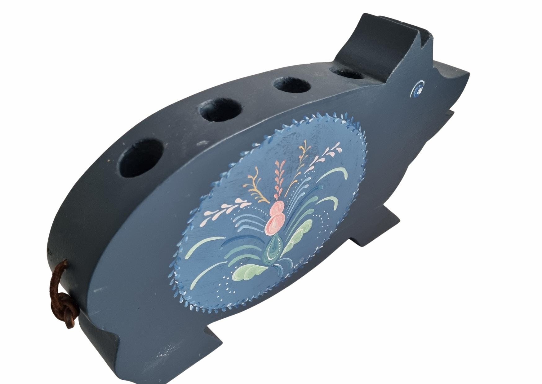 Bring warmth and charm to your winter table with this delightful hand-painted Swedish wooden candle holder, shaped like a pig and painted in soft kurbits-style florals. Holding four taper candles, it’s the perfect blend of folk tradition and festive glow.