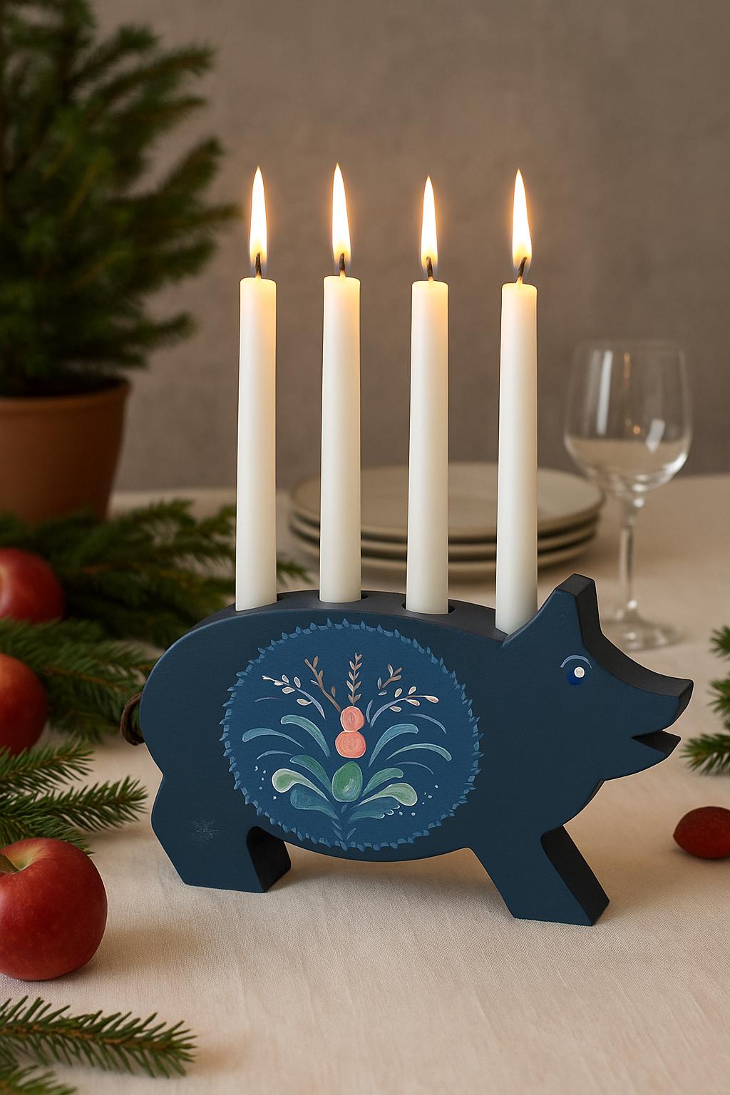 Hand-Painted Swedish Pig Candle Holder – 4 Taper Advent Style – Folk Art Holiday Decor