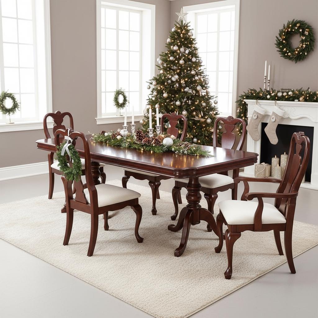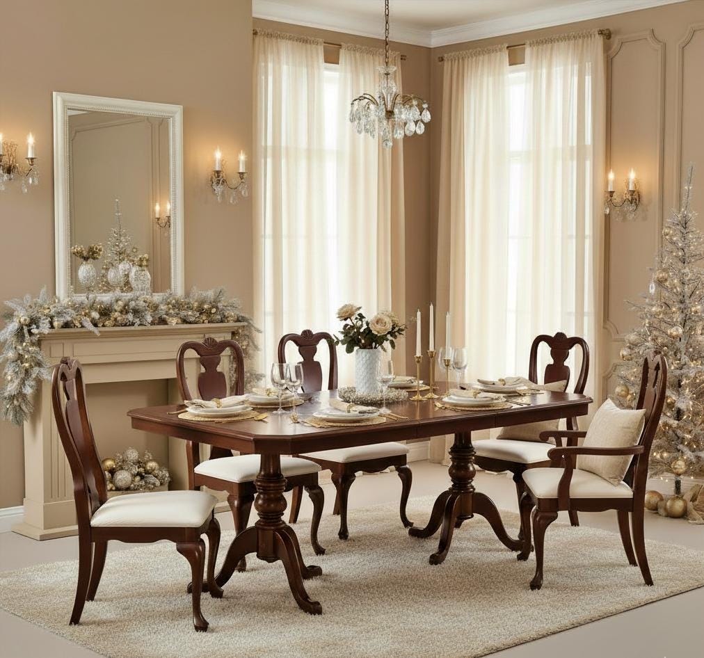 The warm mahogany tones harmonize beautifully with gold, silver, or white holiday decor (as shown in the photos).