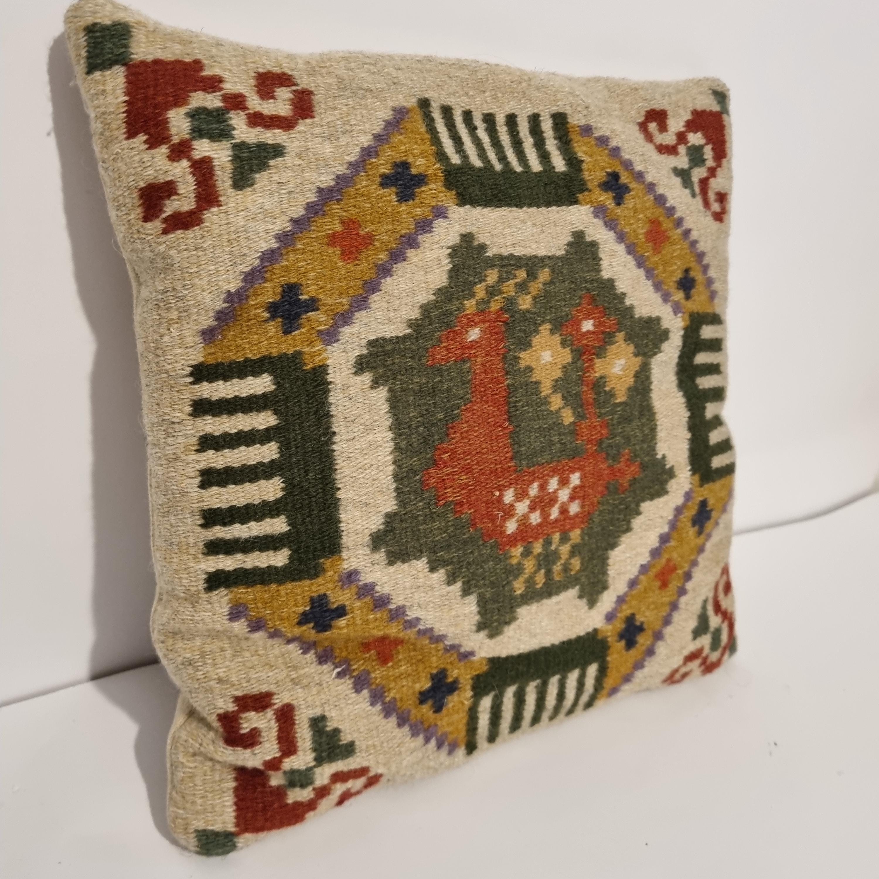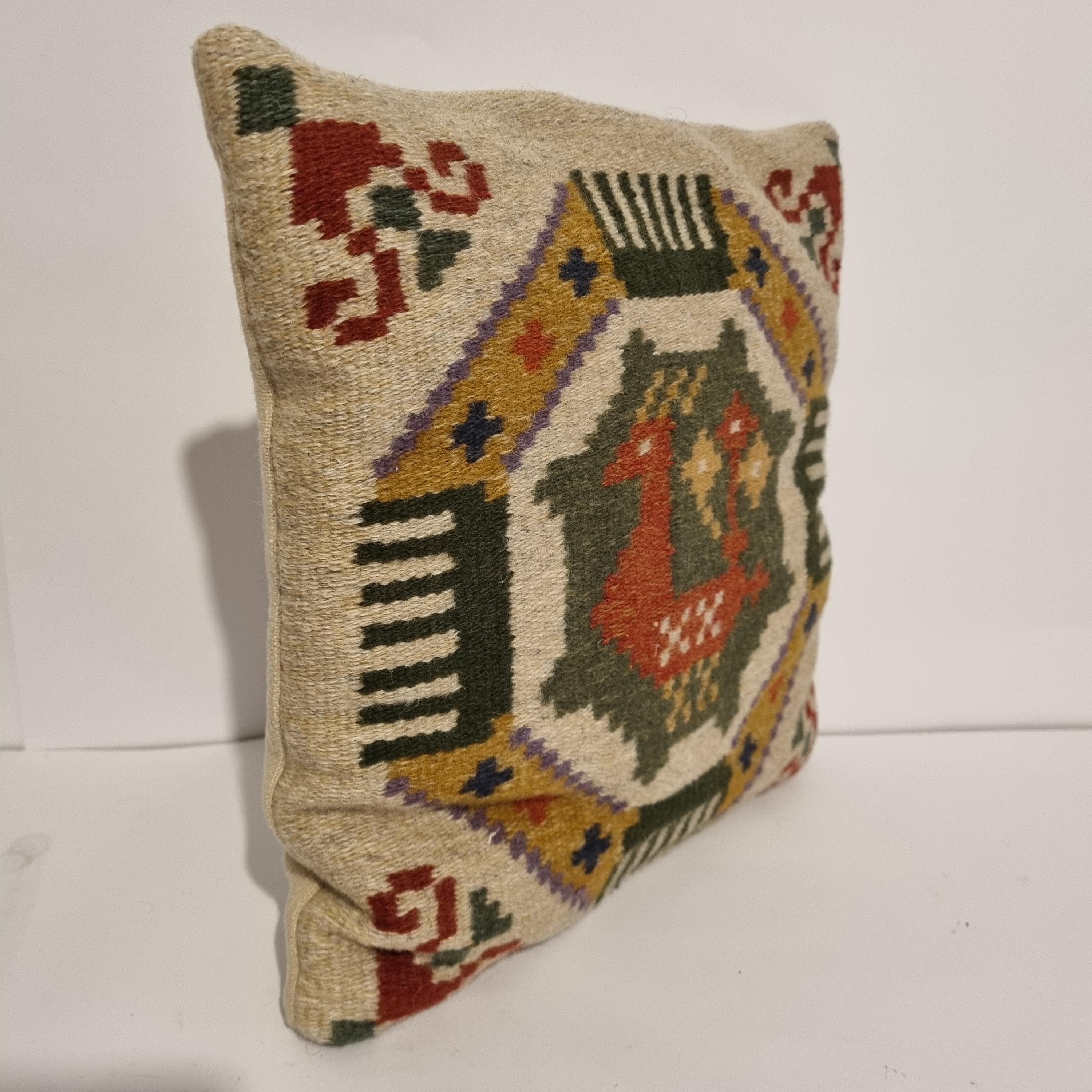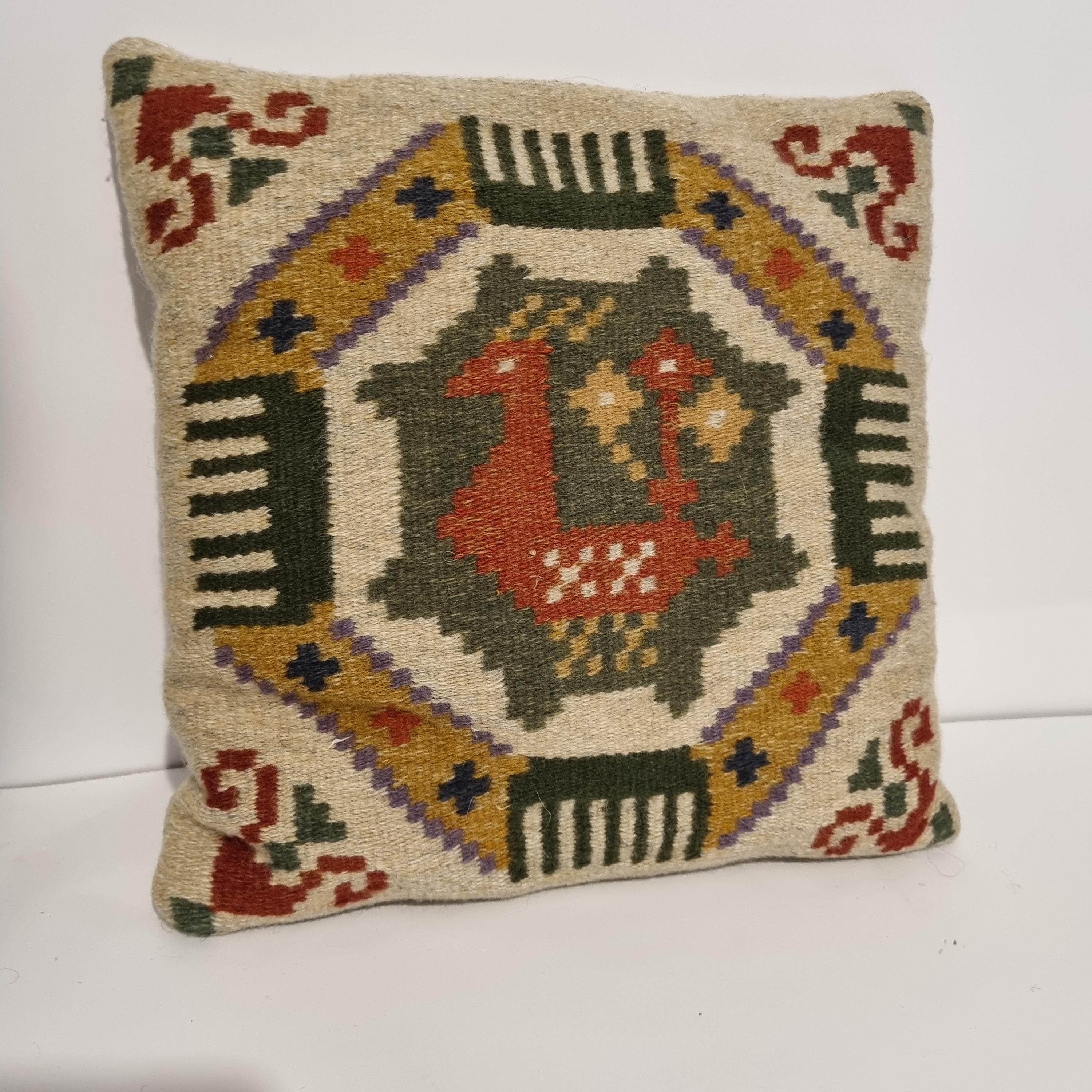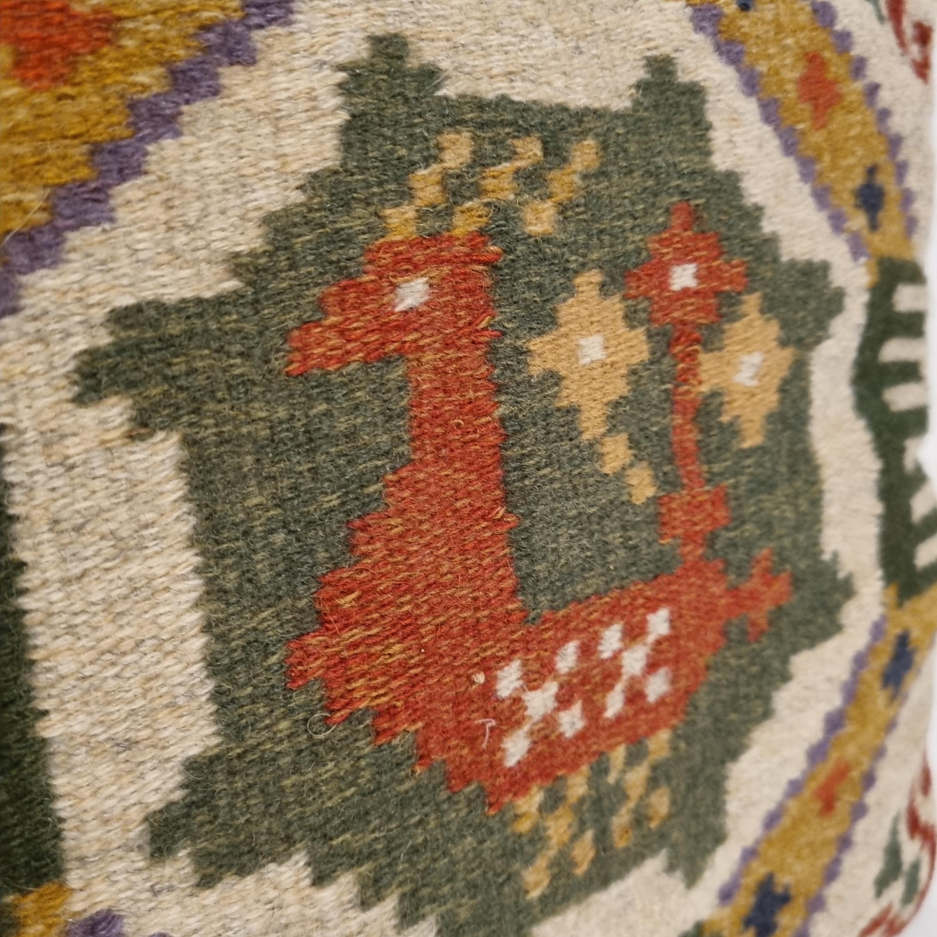 This charming vintage pillow cover comes from a Swedish countryside flea market, where it had clearly been loved for decades. Hand-woven in the traditional röllakan flat-weave technique, it features a folk-art animal motif often found in mid-20th-century Scandinavian textiles.