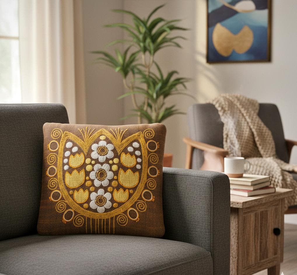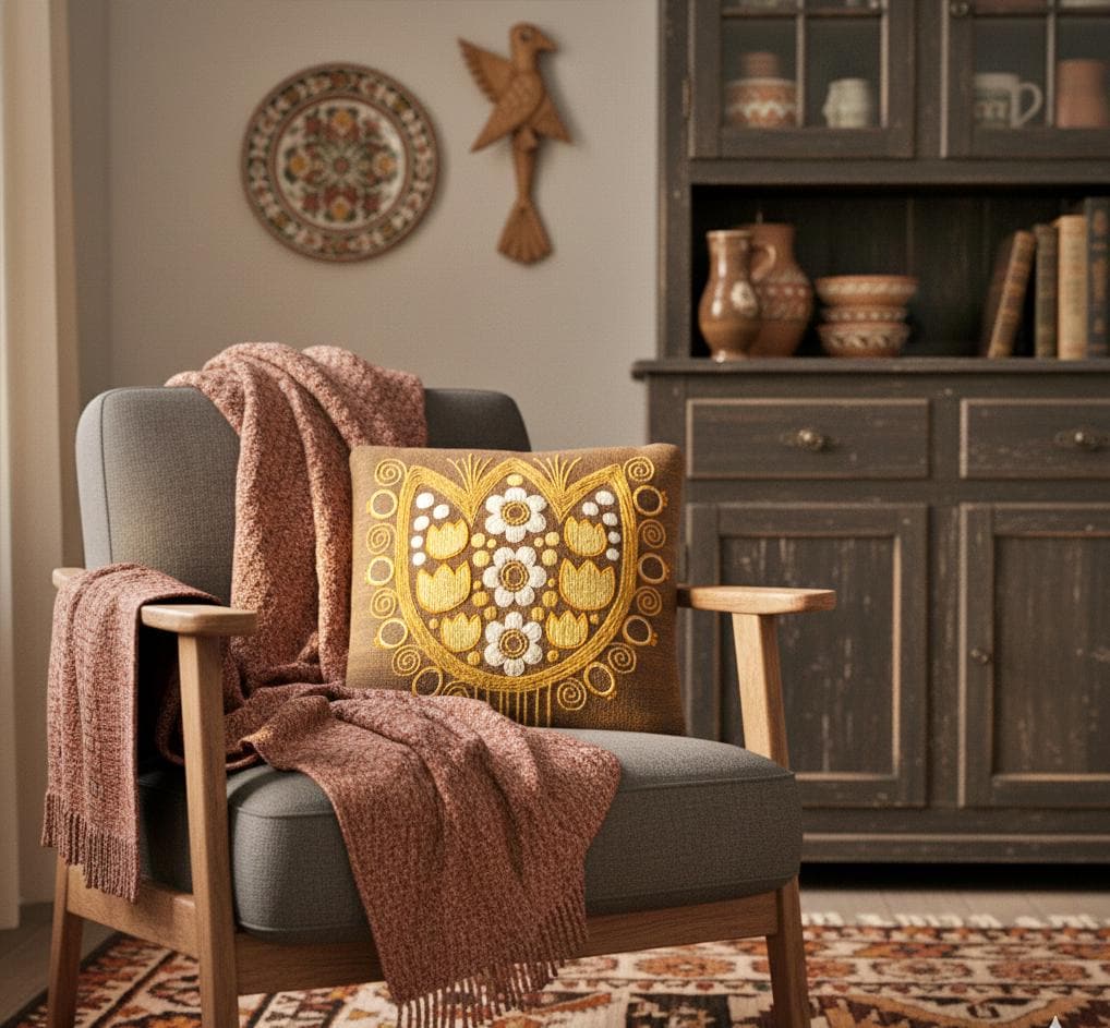 Made of natural wool with warm earthy colors, it carries the quiet, cozy character of old Swedish homes — the kind of piece that adds a touch of history and storytelling to any room.