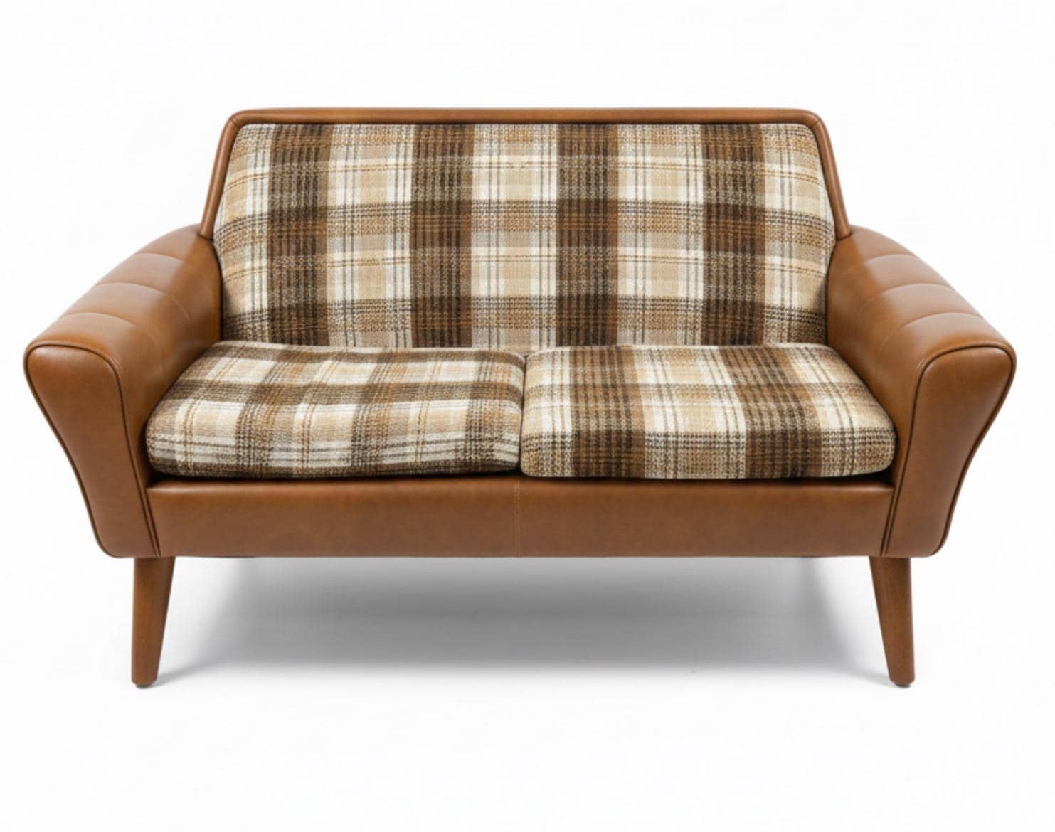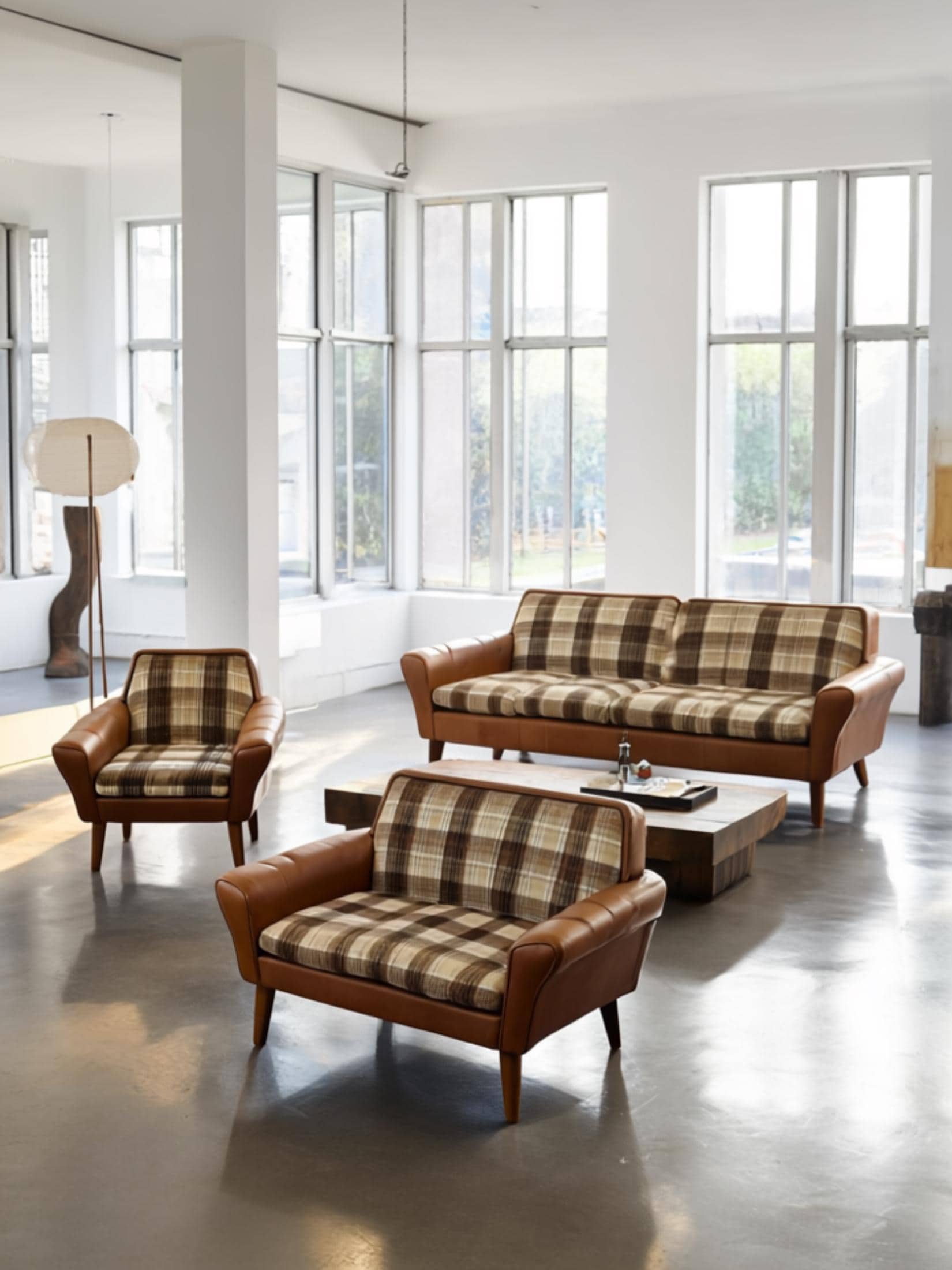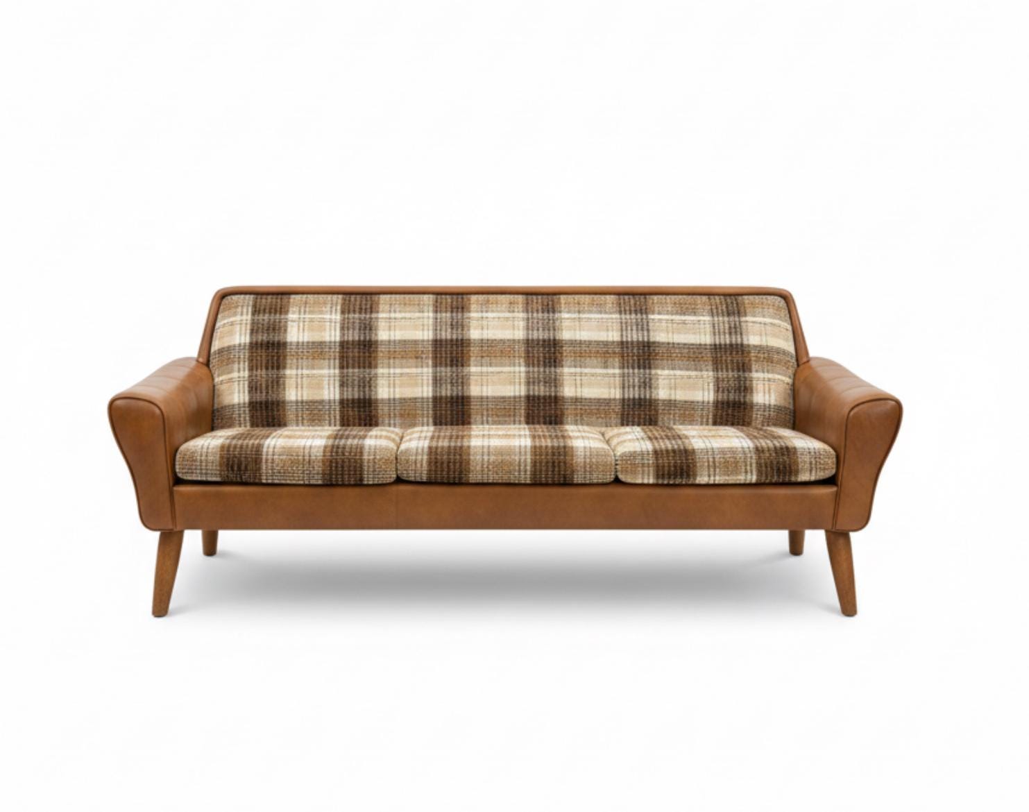 Step back into the warm aesthetic of 1970s Scandinavian modernism with this beautiful three-piece Mid-Century Modern lounge set, becoming available soon for collectors, interior designers, and vintage enthusiasts. The set is in overall good vintage condition, showing age-appropriate wear while preserving its original charm. The well-kept plaid upholstery and classic leather side panels create a timeless contrast, complemented by tapered wooden legs that highlight the clean, iconic Scandinavian silhouette.