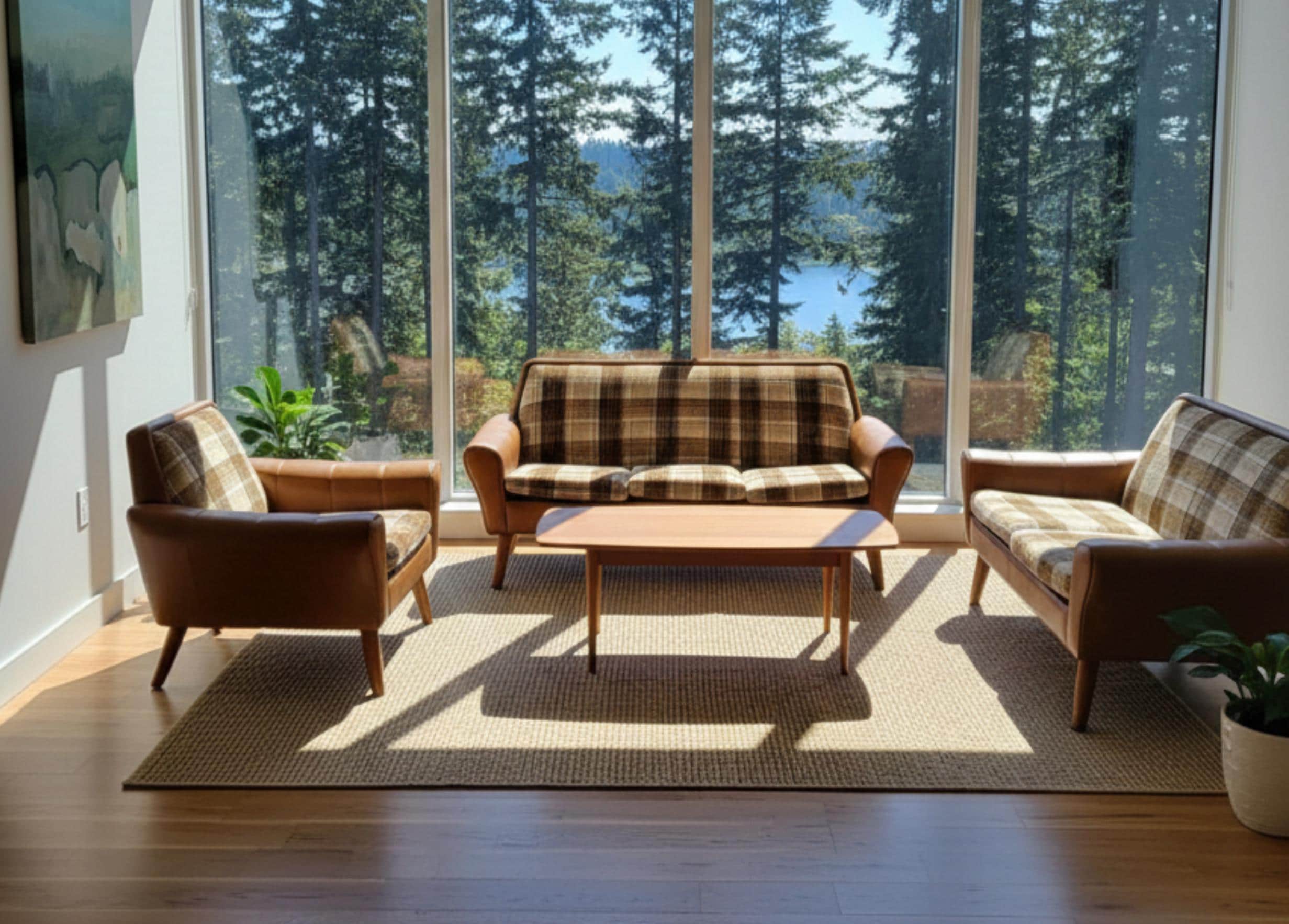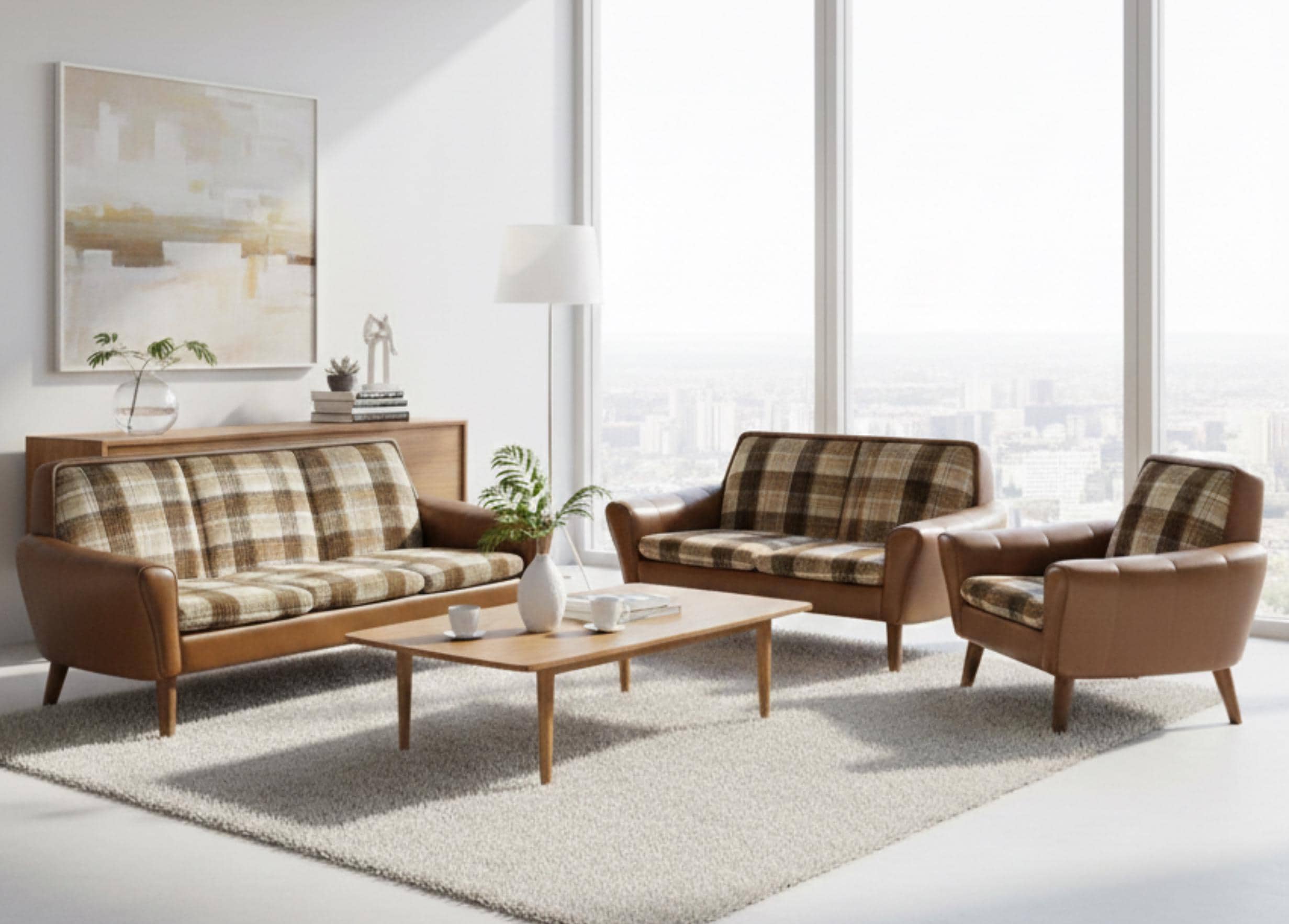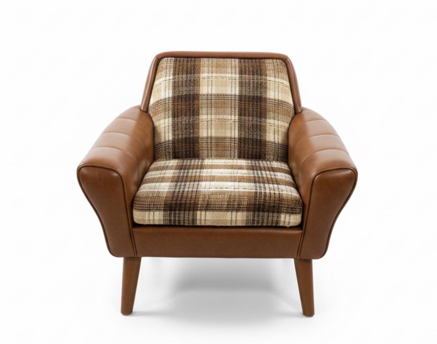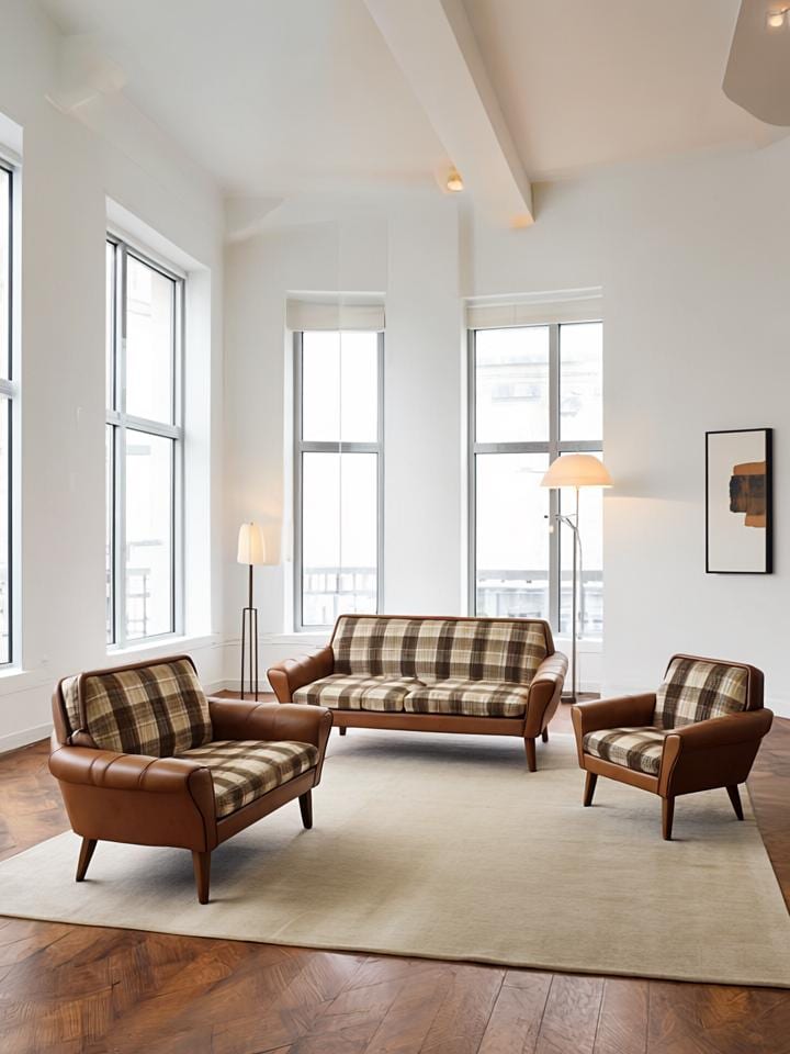 Step back into the warm aesthetic of 1970s Scandinavian modernism with this beautiful three-piece Mid-Century Modern lounge set, becoming available soon for collectors, interior designers, and vintage enthusiasts. The set is in overall good vintage condition, showing age-appropriate wear while preserving its original charm. The well-kept plaid upholstery and classic leather side panels create a timeless contrast, complemented by tapered wooden legs that highlight the clean, iconic Scandinavian silhouette.
