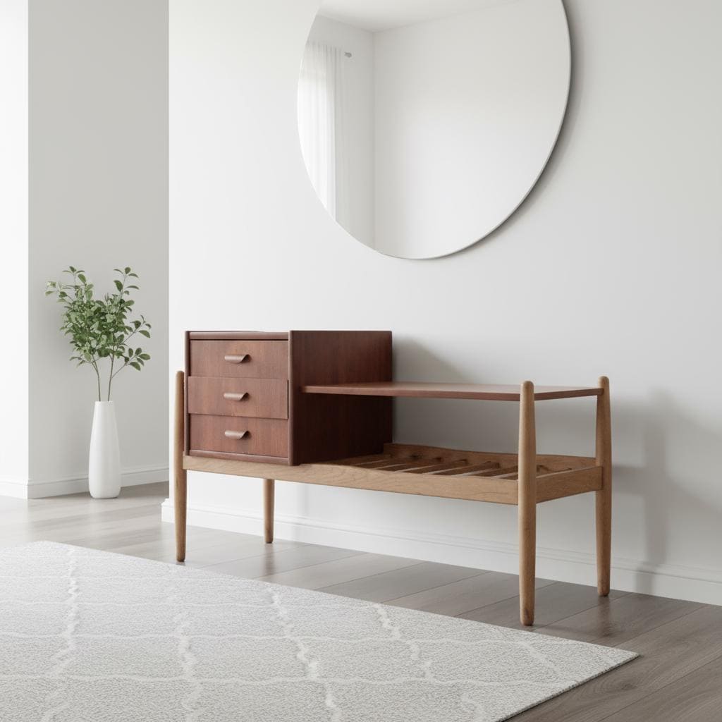 Mid-Century Modern Teak & Oak Hall Table: Arne Wahl Iversen IKEA, 1960s Scandinavian Entryway Bench