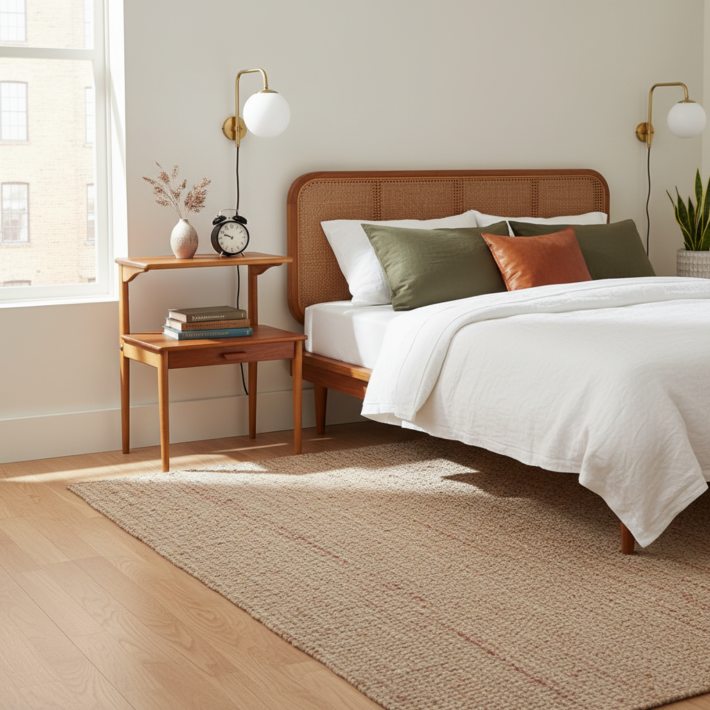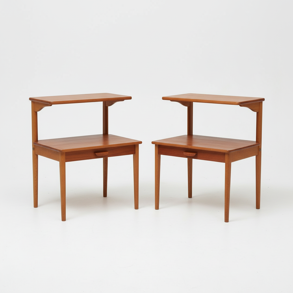 A pair of petite mid-century style bedside tables in warm-toned wood, designed with a light, airy silhouette that fits beautifully even in smaller spaces. The open shelf and raised top create a clean, architectural look, while the small drawer keeps everyday essentials neatly tucked away. Use them as nightstands, side tables in a reading corner, or compact accent tables in a hallway. Softly rounded edges and understated details give these pieces a timeless Scandinavian feel that works well in both minimalist and layered interiors. Dimensions (each): length 43 cm, width 32 cm, height 54 cm. We ship them in beautifully restored condition.