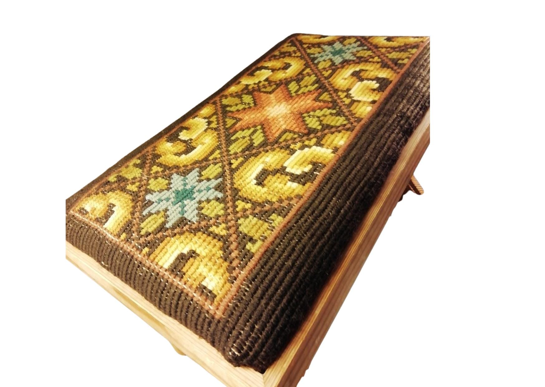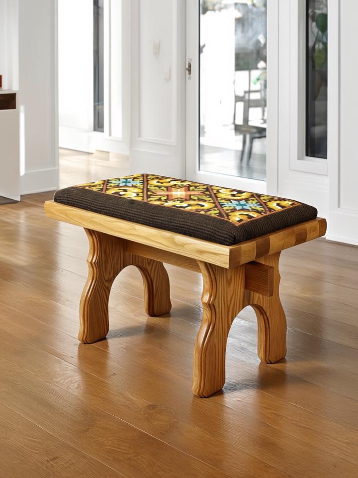Rustic Wooden Stool with Embroidered Cushion – Farmhouse Entryway Bench