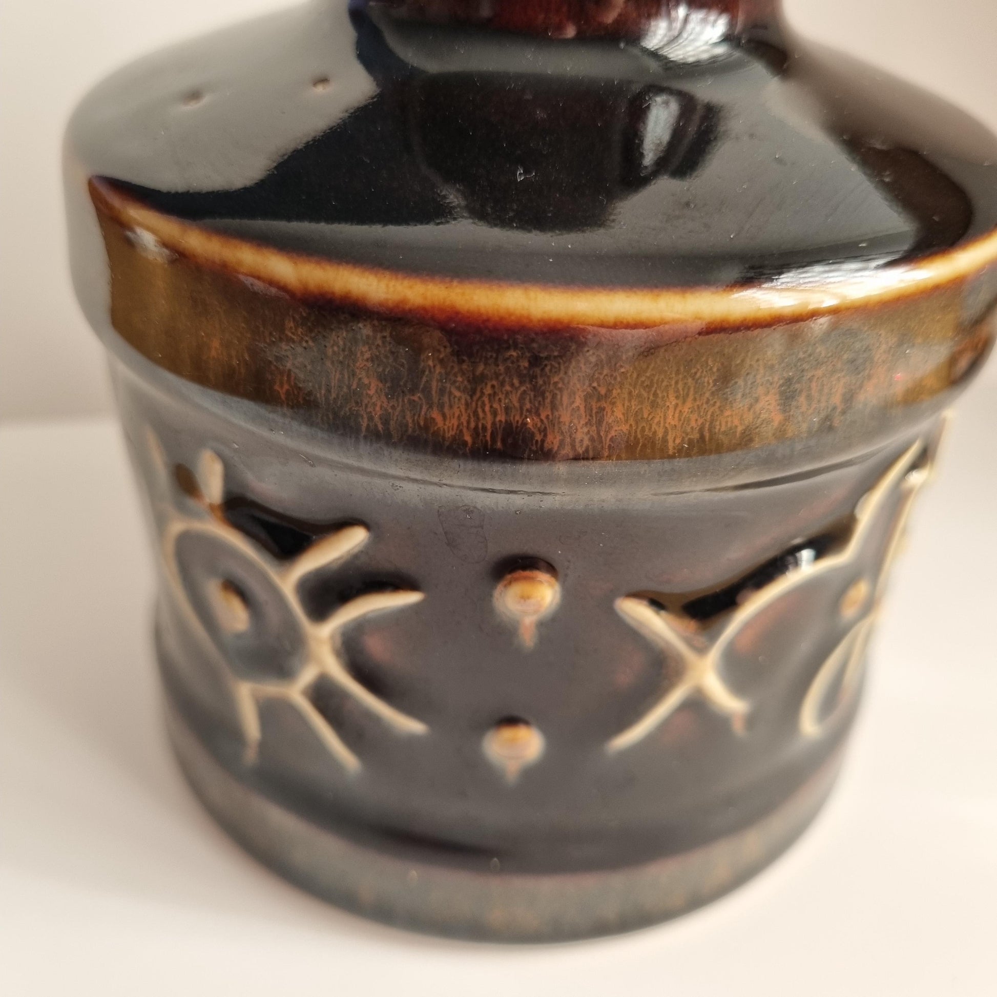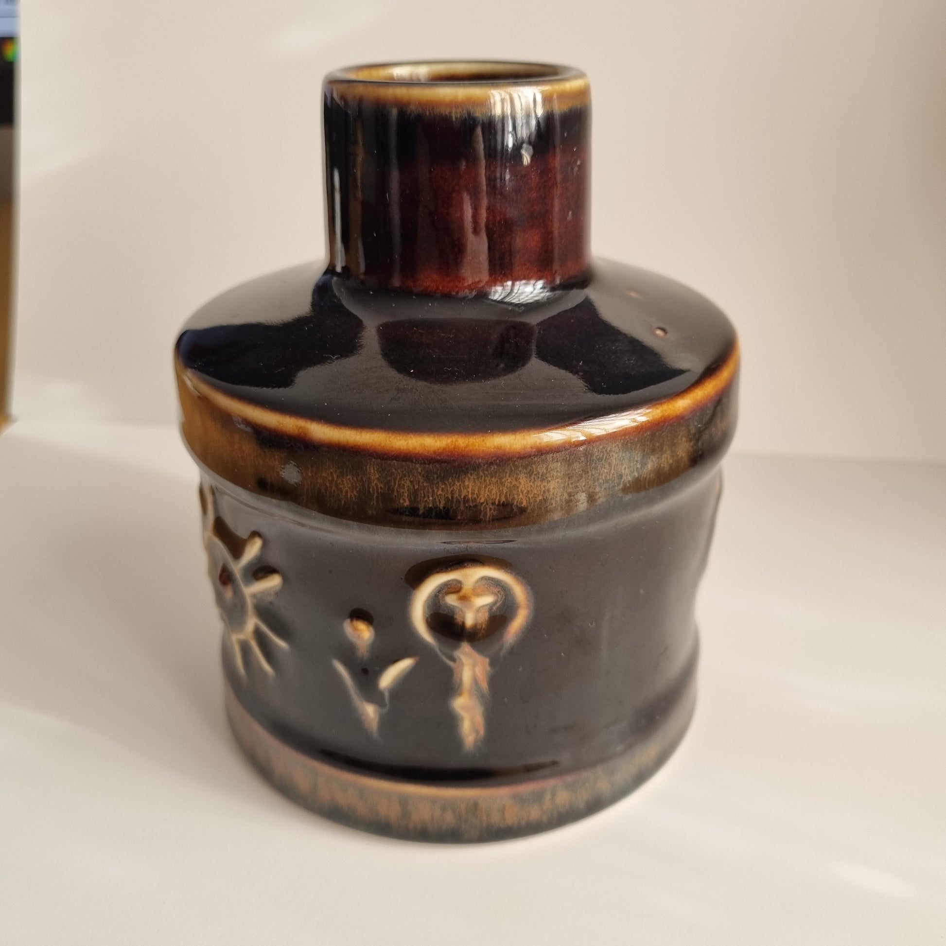 This beautiful vase from the sought-after Fibula series showcases earthy tones of chocolate-brown and beige, highlighted by a lustrous glaze. The relief pattern features stylized Scandinavian Runes and the Sun on both sides, making it a striking representation of Scandinavian Art Pottery from the 60s. Carl-Harry Stålhane's unique artistry is evident in the design, embodying the elegance of Mid-Century Modern ceramics.