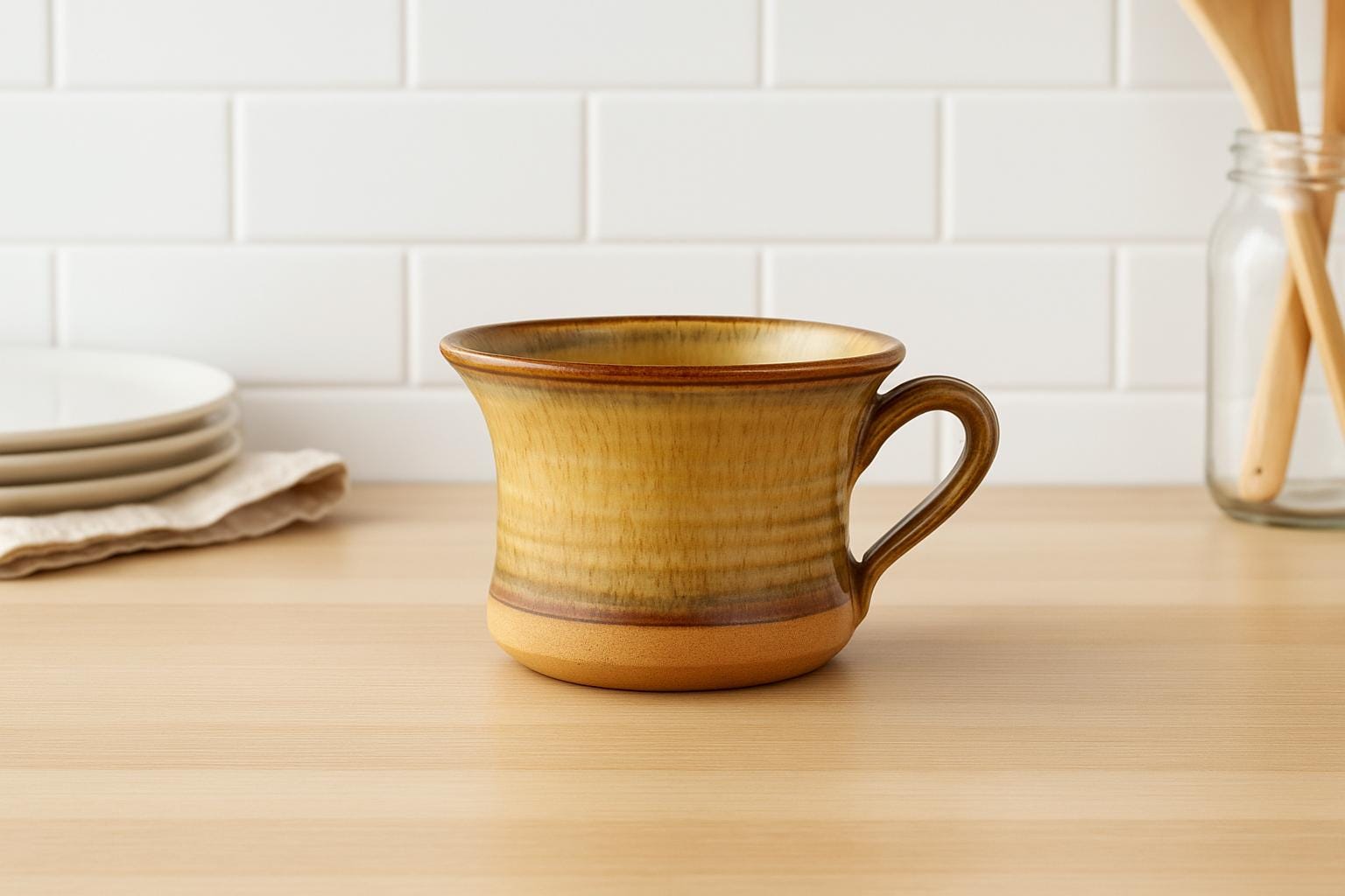 This hand-thrown stengods (stoneware) ceramic mug vase is a fine example of Scandinavian craftsmanship. Made by skilled Swedish artisans, the piece features a rich, earthy glaze in warm brown and beige tones. The subtle relief patterns on the surface reflect a rustic, yet refined aesthetic that is typical of mid-century modern Scandinavian design. Its wide rim and comfortable handle make it a versatile decorative item or functional vase.