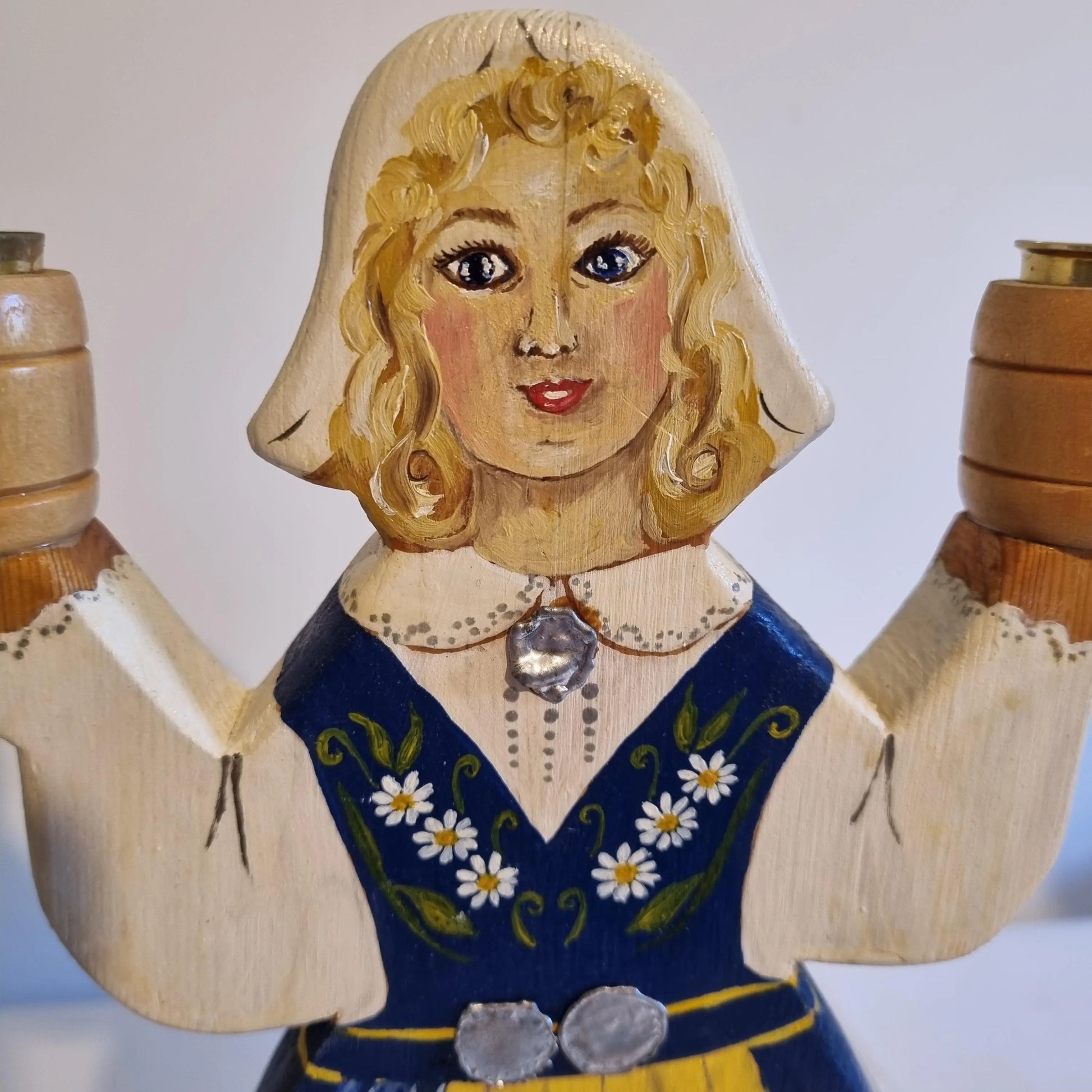 This beautiful pair of hand-carved and hand-painted wooden candle holders depicts a man and a woman in traditional Swedish folk costumes. Each figure is richly decorated in blue and yellow – the national colors of Sweden – with delicate floral detailing. Both pieces are signed by Ateljé Ladetorp and bear the artist’s unique signature, making them authentic vintage Scandinavian folk art collectibles. They are ideal for display on a mantelpiece, a dining table, or as a striking addition to a collector's shelf.