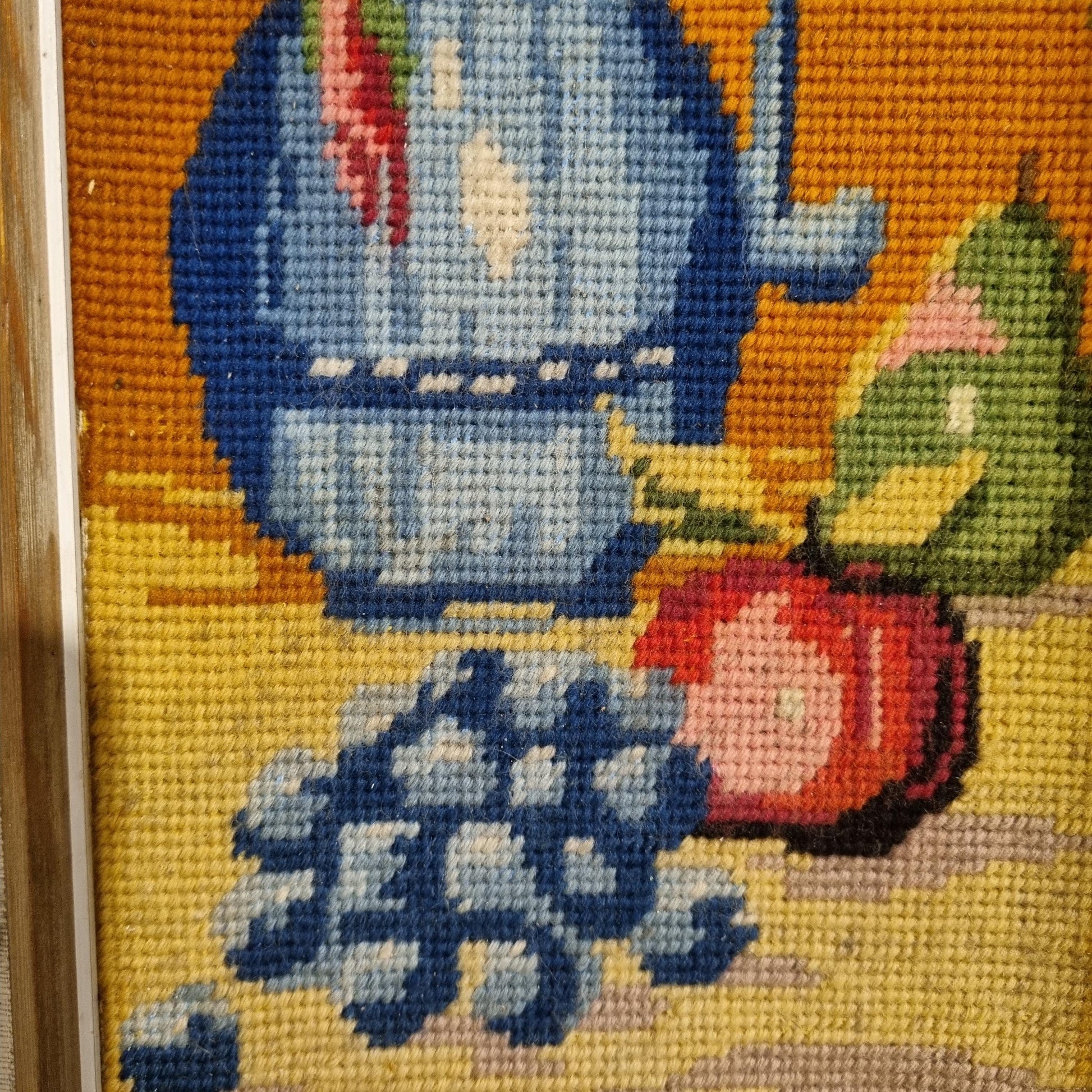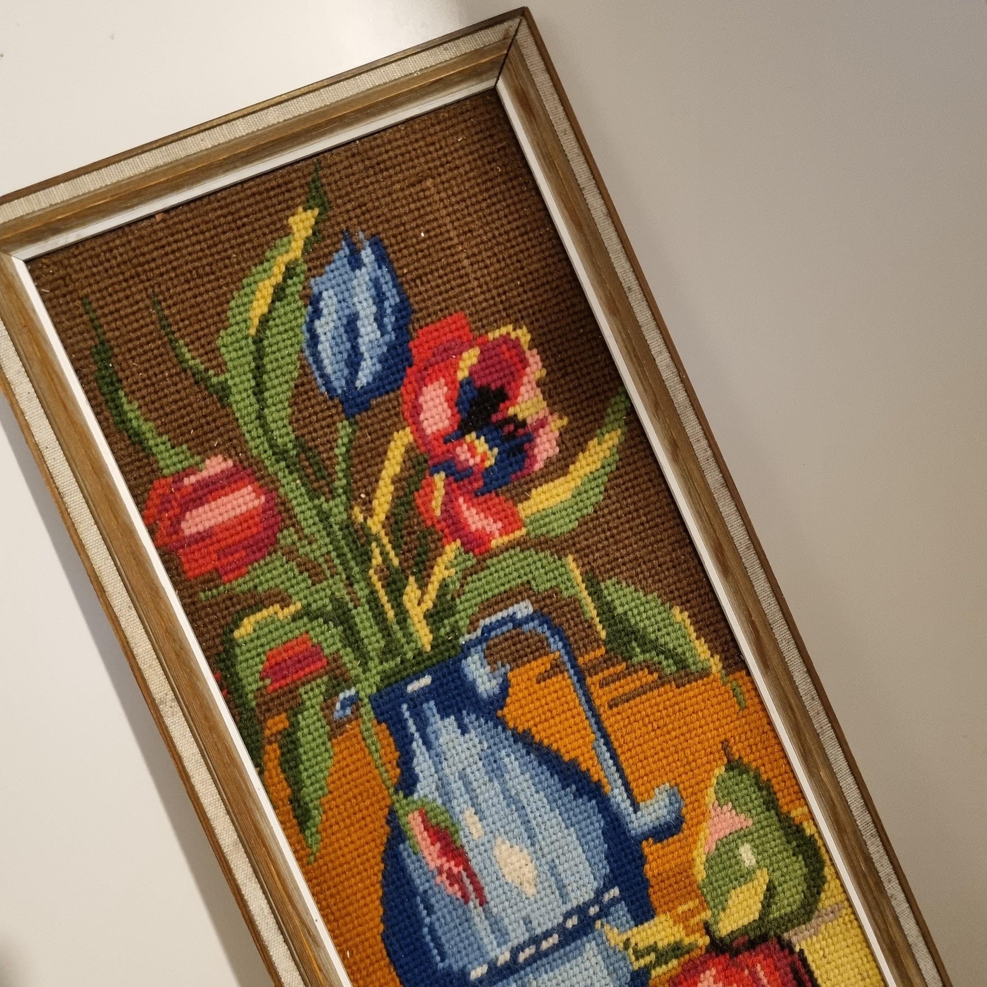 This Scandinavian vintage needlepoint features a hand-stitched floral still life, with vibrant colors and detailed craftsmanship. The composition centers around a blue vase and fruit, reflecting the simplicity and aesthetic of mid-20th century Scandinavian design. The embroidery is set in a thin wooden frame, preserving the classic charm of the original piece.