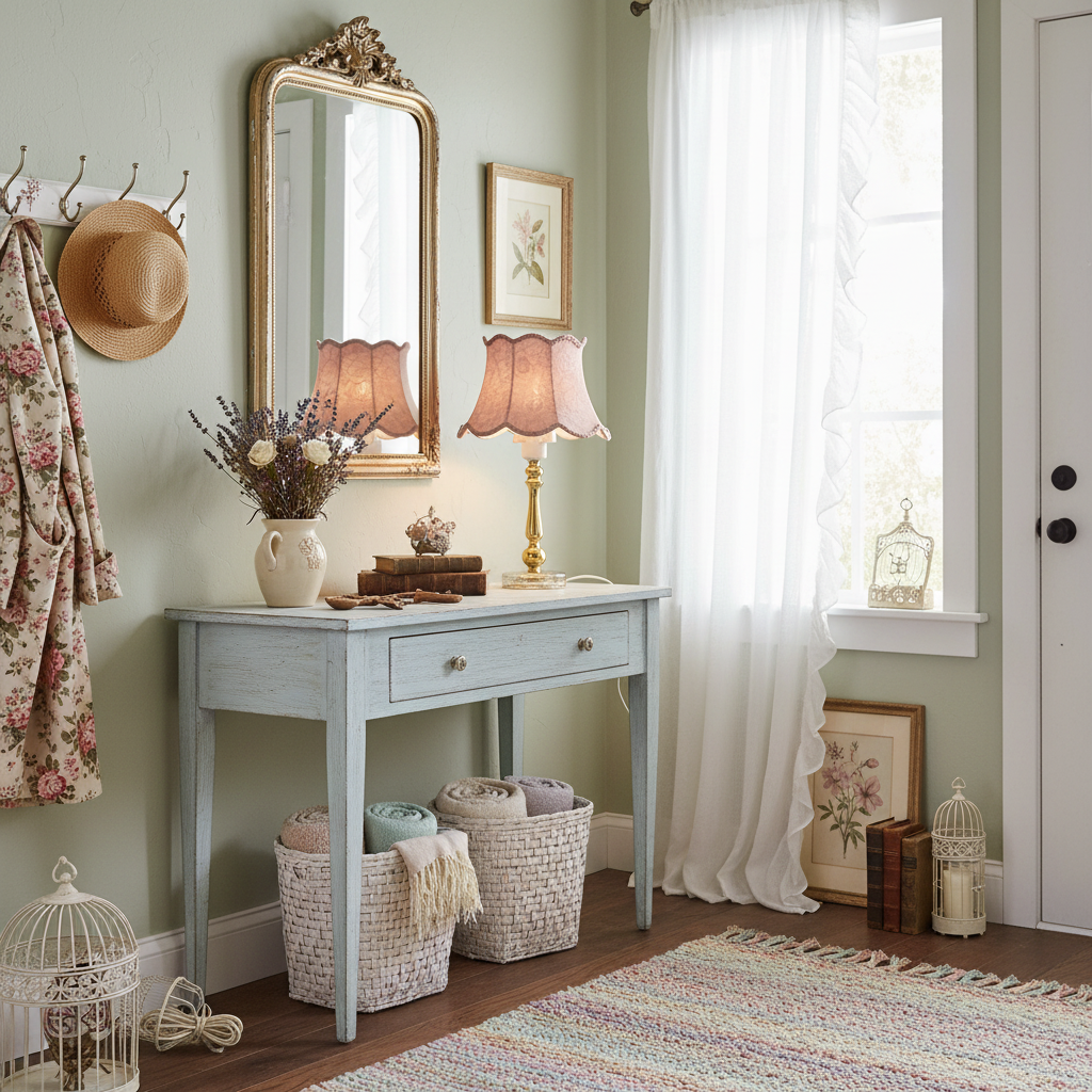 The shade is the true highlight: a gentle, faded powder rose color with an authentic early-to-mid 20th-century printed motif. It casts a warm, elegant glow that instantly creates atmosphere.