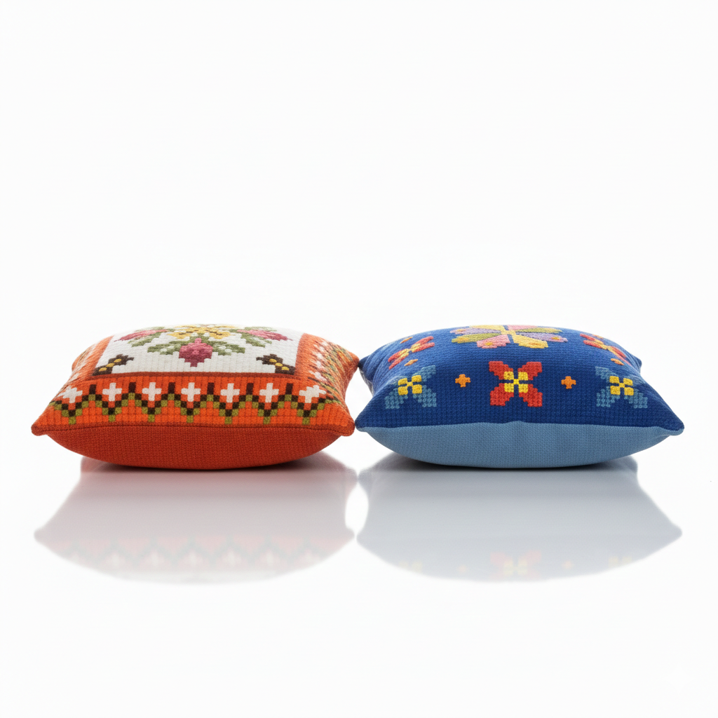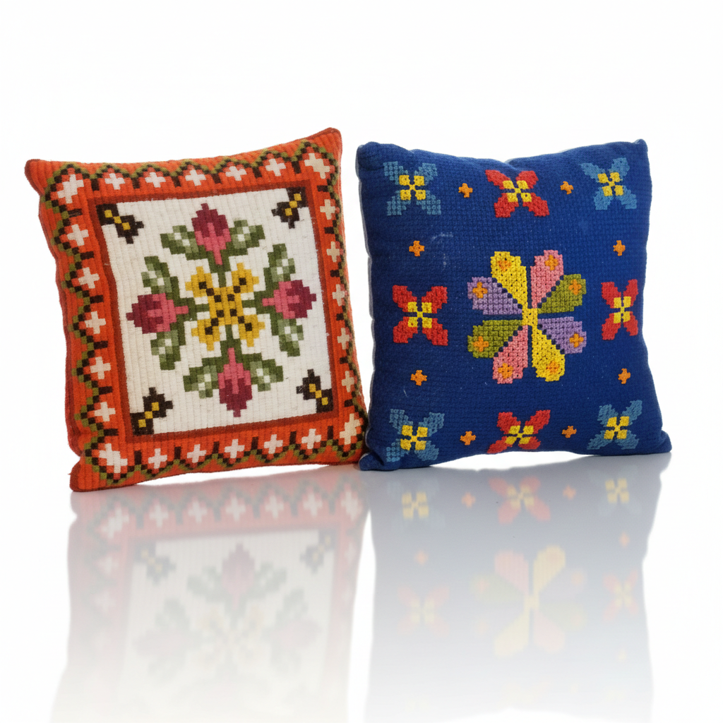 Set of two vintage hand-embroidered needlepoint cushions with colourful Scandinavian folk-style motifs. One features a bright orange border with a floral centre on a cream background, the other has a deep blue background with a multicolour flower and small motifs. Perfect as a cheerful retro accent for a sofa or armchair.