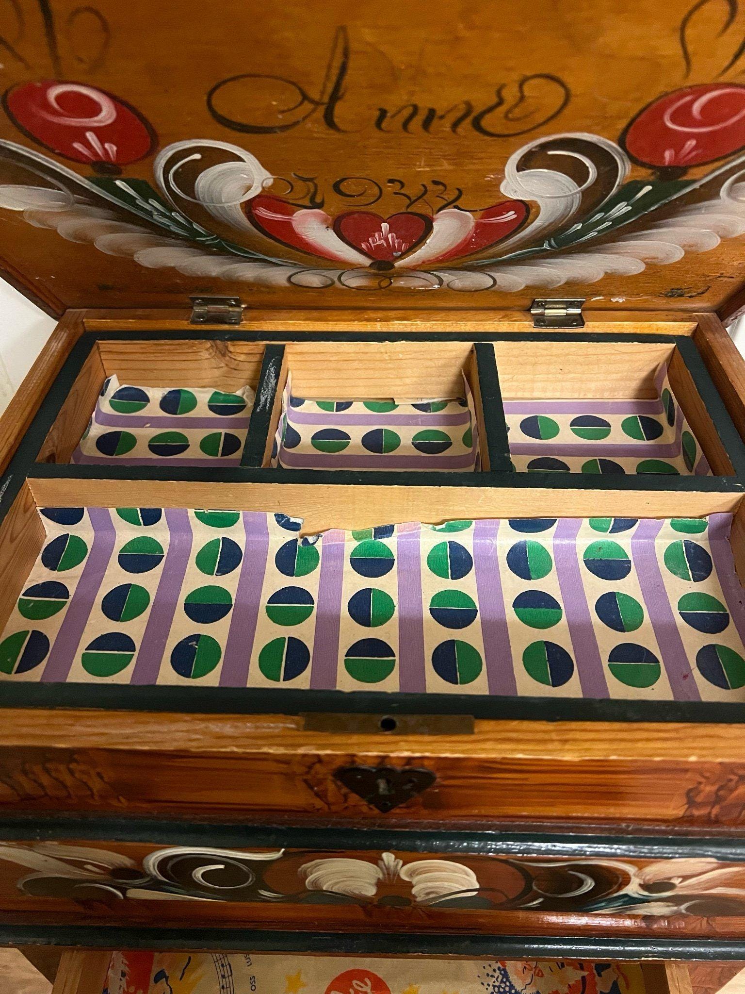 Vintage Kurbitsmaleri Sewing Chest: Swedish Dalarna Folk Art, 1944