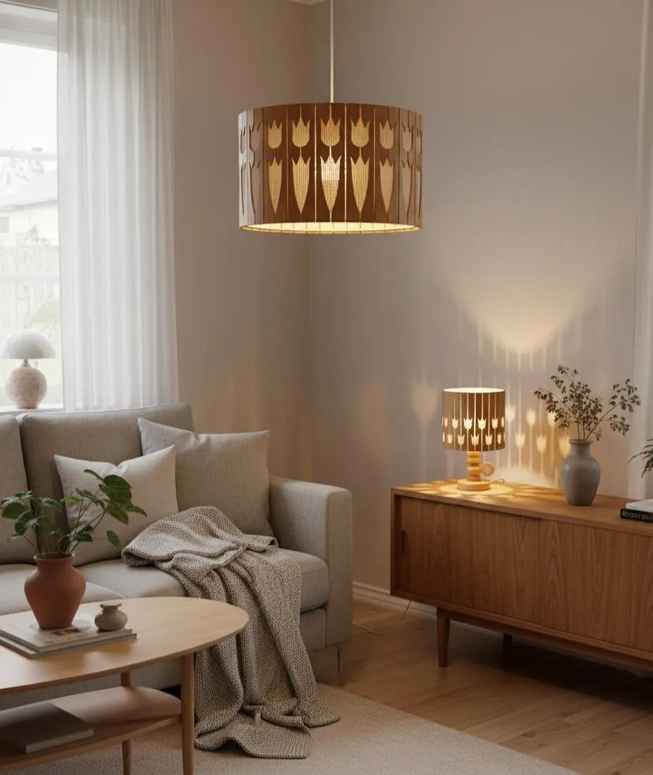 Vintage Scandinavian Pendant Lamp – Handcrafted Tulip Motif in Natural Wood