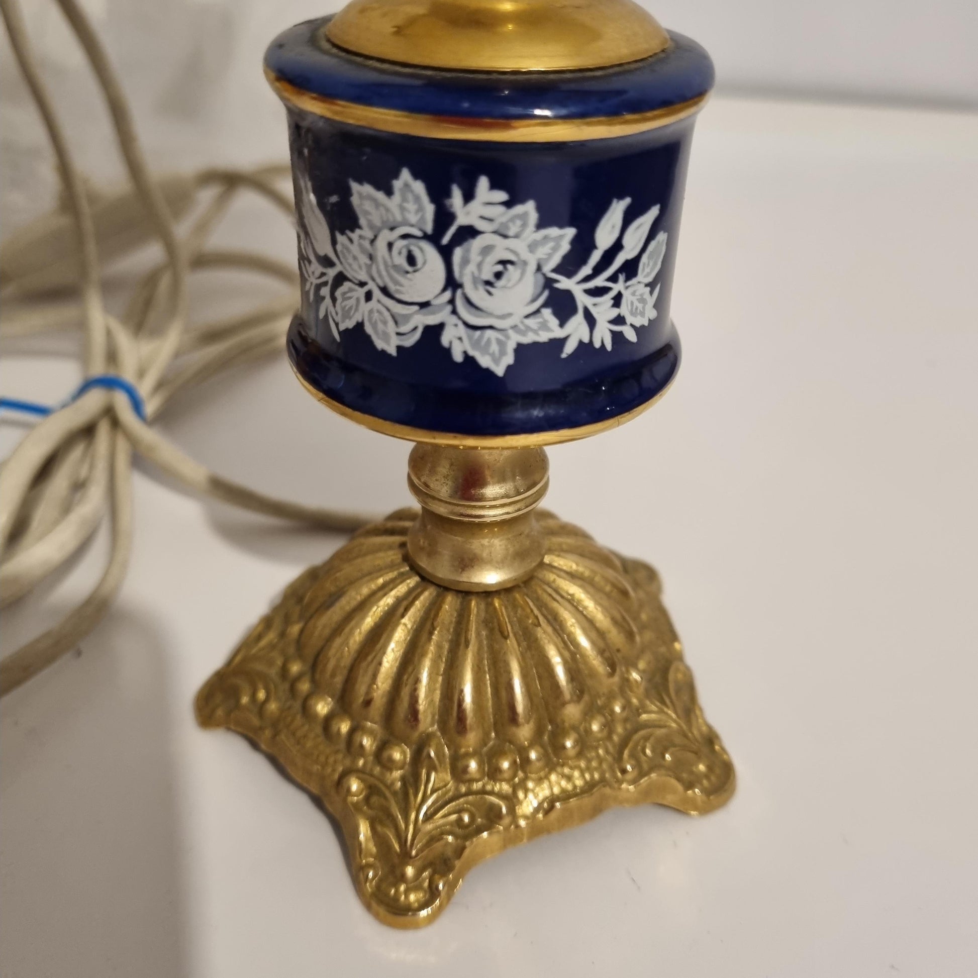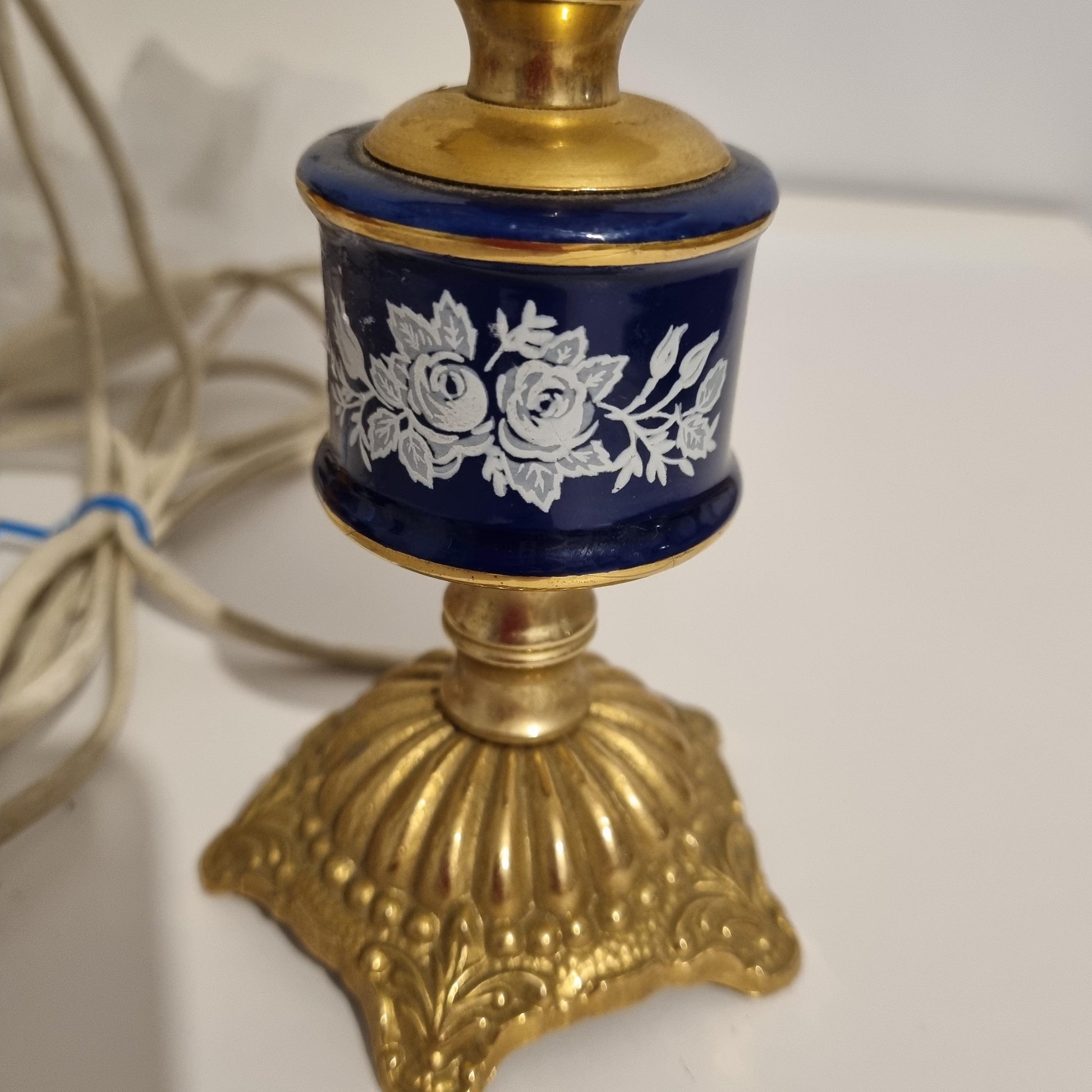 The lamp consists of a dark blue and white ceramic part decorated with floral motifs, a gilded copper base with claw-like legs. The warm-toned fabric shade diffuses the light softly, creating a cozy and nostalgic atmosphere.