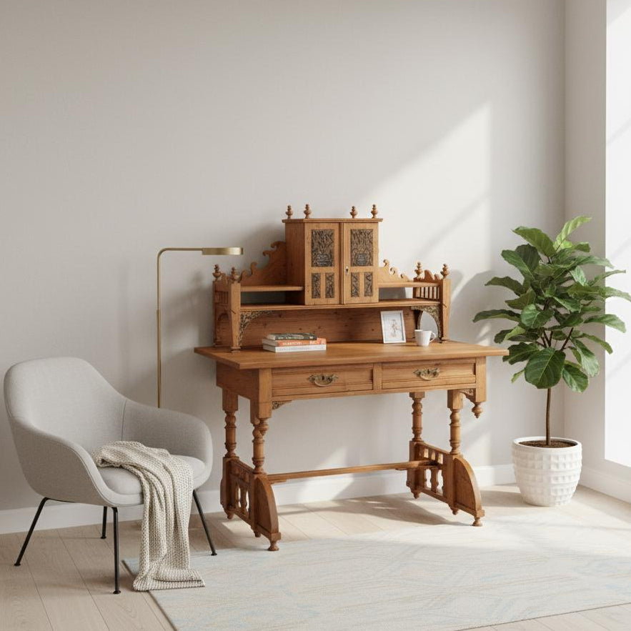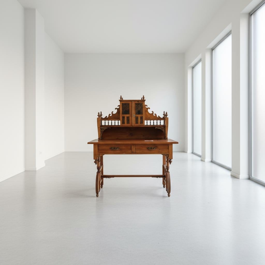 The graceful turned legs, carved details, and upper hutch with cabinet doors create a balanced harmony between craftsmanship and organic imperfection — an ideal piece for a serene workspace, creative studio, or minimalist interior valuing authenticity over perfection.
